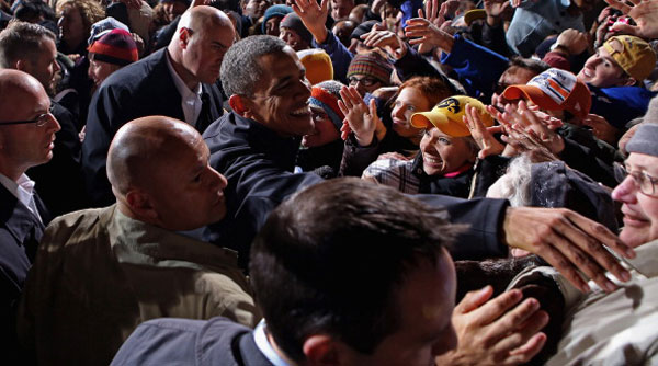 Tổng Thống Barack Obama được cử tri da trắng hoan nghênh tại Des Moines, Iowa, trong đêm vận động cuối cùng trước ngày bầu cử 5 Tháng Mười Một, 2012. (Hình: Getty Images/Chip Somodevilla)