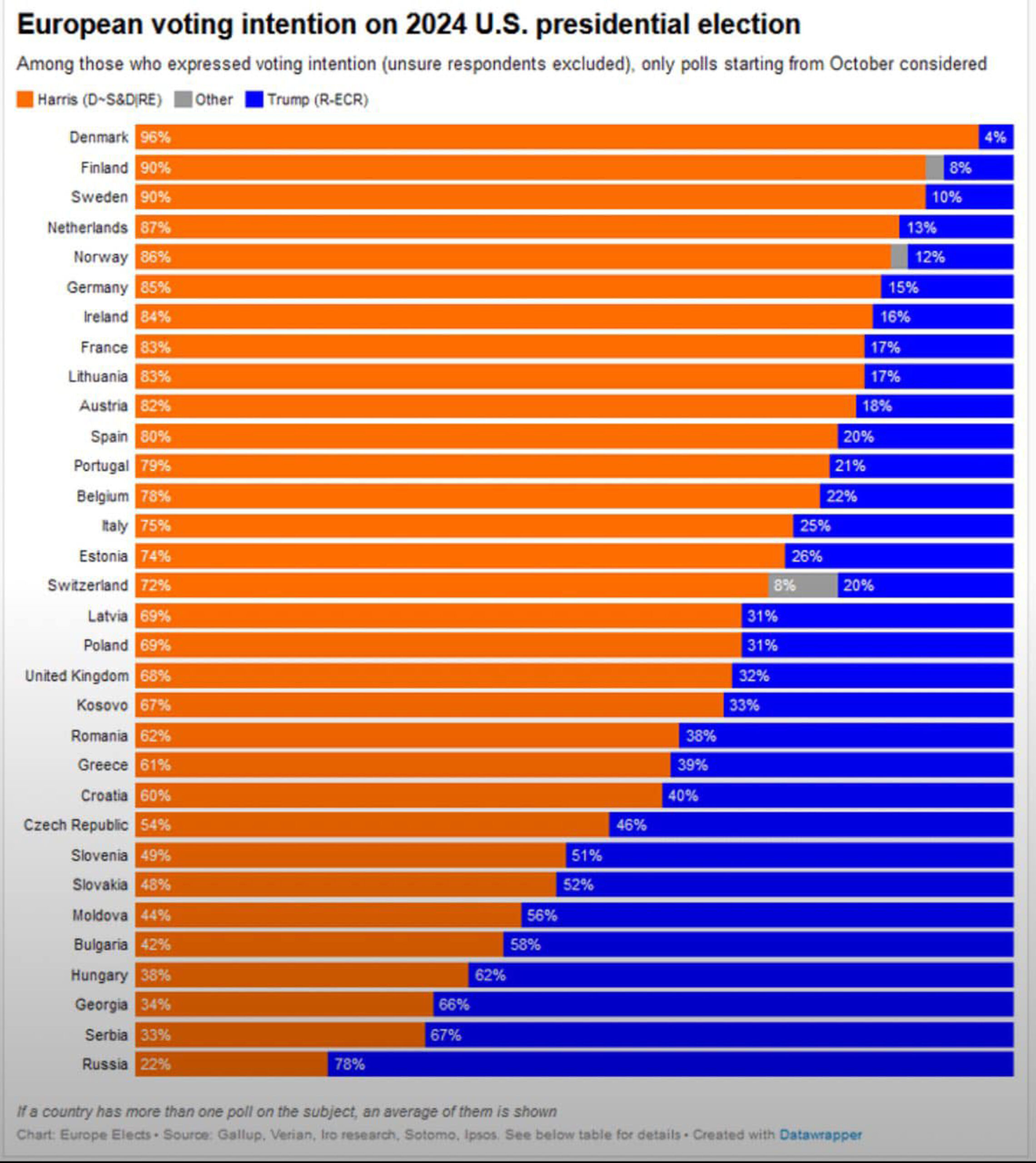 Củng cố cho kết quả khảo sát của The Economist-Globalscan, tổ chức Europe Elects – một công ty tư vấn chính trị và thăm dò ý kiến của Châu Âu – trong Tháng Mười vừa qua đã tiến hành khảo sát dư luận 32 quốc gia Châu Âu về quan điểm của họ đối với hai ứng cử viên Donald Trump và Kamala Harris.