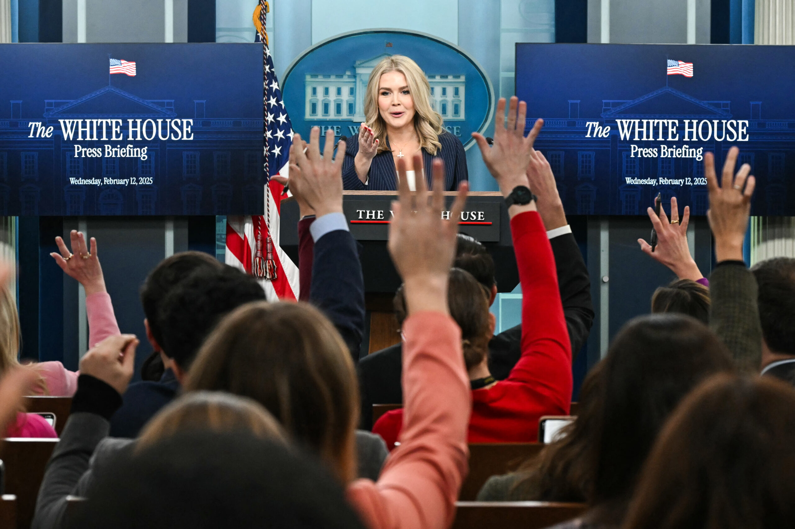 Karoline Leavitt, thư ký báo chí Tòa Bạch Ốc, tại cuộc họp báo hôm 12 Tháng Hai, 2025. (Hình: Andrew Caballero-Reynolds/AFP via Getty Images)