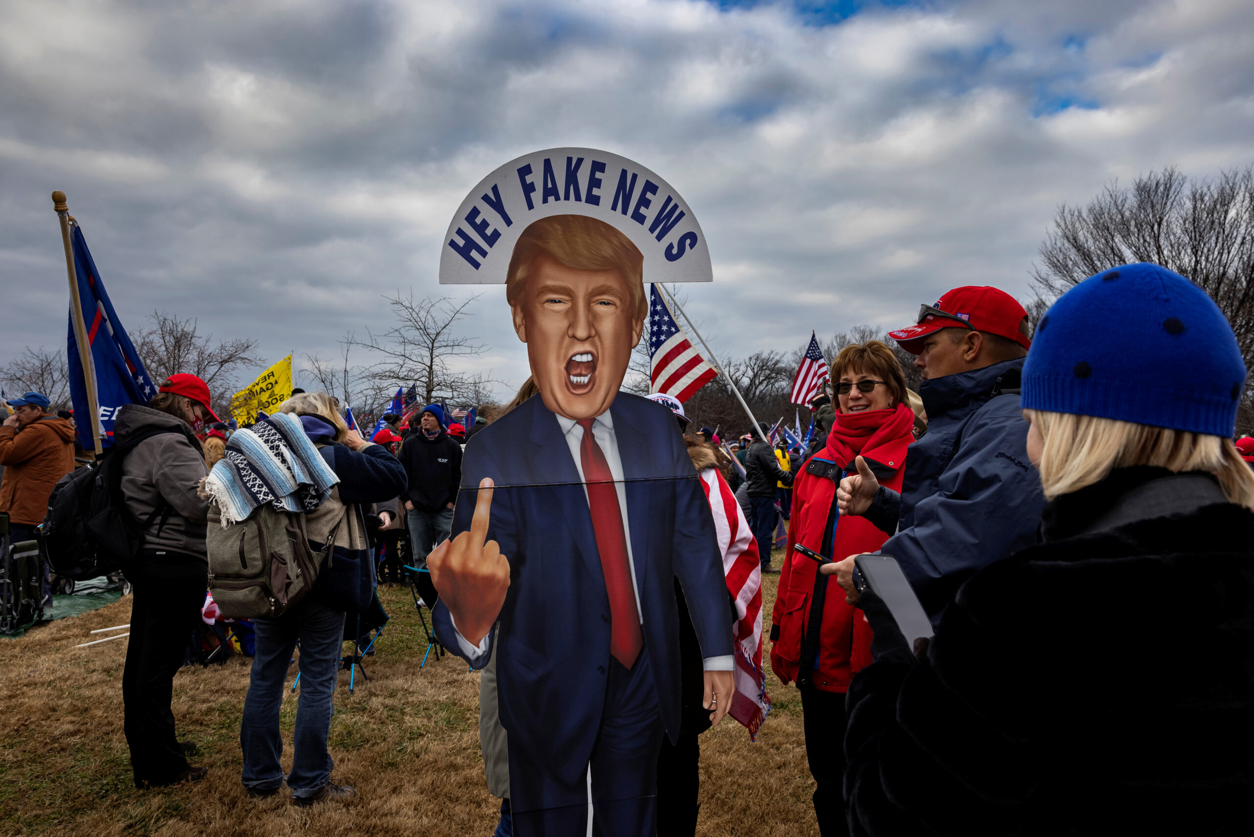 Người biểu tình mang theo hình ảnh của Trump trong vụ bạo loạn ngày 6 Tháng Giêng, 2021, ở Capitol, Washington DC. (Hình minh họa: Brent Stirton/Getty Images)