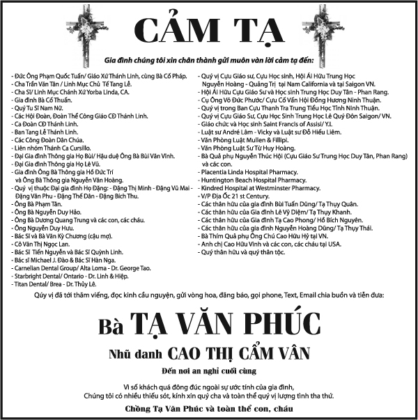 Bà Tạ Văn Phúc June 9, 2016 : 8:02 PM TIN LIÊN QUANMORE FROM AUTHOR Luật Sư Nguyễn Xuân Nghĩa Cụ Ông Phạm Văn Khỏe Bà Nguyễn Thị Thúy Ban Bà Quả Phụ Lê Khánh Ông Lê Thành Long Bà Bùi Diệu Thanh