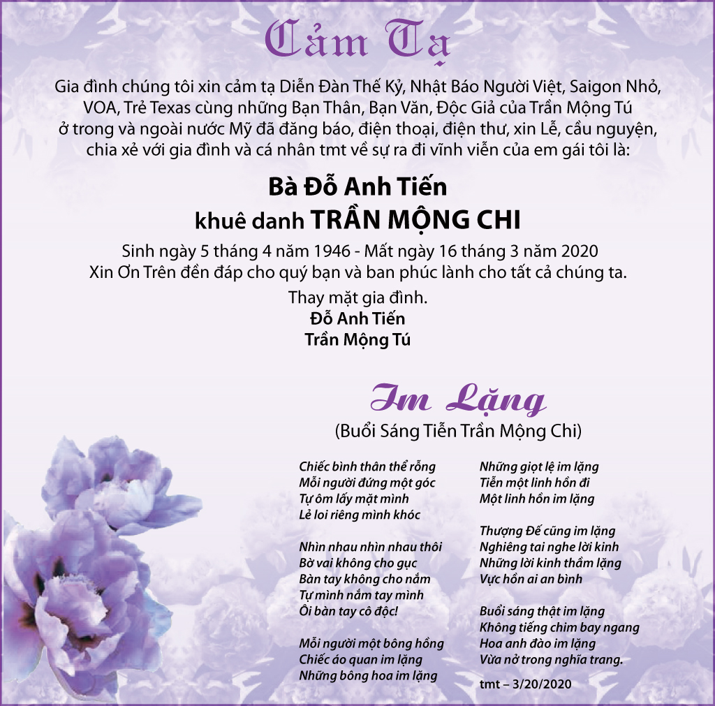 Bà Ðỗ Anh Tiến March 21, 2020 : 8:24 PM FacebookXEmailPrint FacebookXEmailPrint CO THE BAN QUAN TAM Luật Sư Nguyễn Xuân Nghĩa April 17, 2026 : 6:36 PM Cụ Ông Phạm Văn Khỏe April 2, 2026 : 6:09 PM Bà Nguyễn Thị Thúy Ban March 30, 2026 : 4:08 PM Bà Quả Phụ Lê Khánh March 27, 2026 : 6:17 PM Ông Lê Thành Long March 13, 2026 : 6:25 PM Bà Bùi Diệu Thanh February 20, 2026 : 5:46 PM Cụ Ông Đào Hữu Tiếu February 6, 2026 : 5:36 PM Bác Sĩ Nguyễn Đình Khôi February 2, 2026 : 5:19 PM [disqus_shortcode_codeable] Cáo Phó Ông Vũ Công Thành April 17, 2026 : 6:34 PM Bác Sĩ Trần Cao Để April 17, 2026 : 6:30 PM Cụ Ông Nguyễn Hữu Thời April 17, 2026 : 6:28 PM Ông Đỗ Duy Đức April 17, 2026 : 6:26 PM Bà Quả Phụ Trần Huyến (nhũ danh Bùi Thị Chi) April 15, 2026 : 7:12 PM Phân Ưu Bà Trần Thị Sâm April 21, 2026 : 6:15 PM Cụ Bà Trần Thị Sâm April 21, 2026 : 6:13 PM Đồng Chí Nguyễn Hữu Thời April 21, 2026 : 6:05 PM Cụ Ông Nguyễn Hữu Thời April 19, 2026 : 7:12 PM Bác Sĩ Trần Cao Đễ April 17, 2026 : 6:38 PM Tưởng Nhớ Huynh Trưởng Du Ca Nguyễn Thiện Cơ January 16, 2026 : 4:54 PM Những buổi tối nơi căn nhà trong hẻm Thành Thái October 19, 2025 : 12:59 PM Doãn Quốc Sỹ, nhà văn, nhà giáo October 19, 2025 : 12:48 PM Nhớ Trưởng Hướng Đạo – Nhà văn Nhật Tiến October 4, 2025 : 5:41 PM Em gái nhạc sĩ Nguyễn Vũ viết về anh trai: Nụ cười hiền hòa... October 2, 2025 : 7:13 PM
