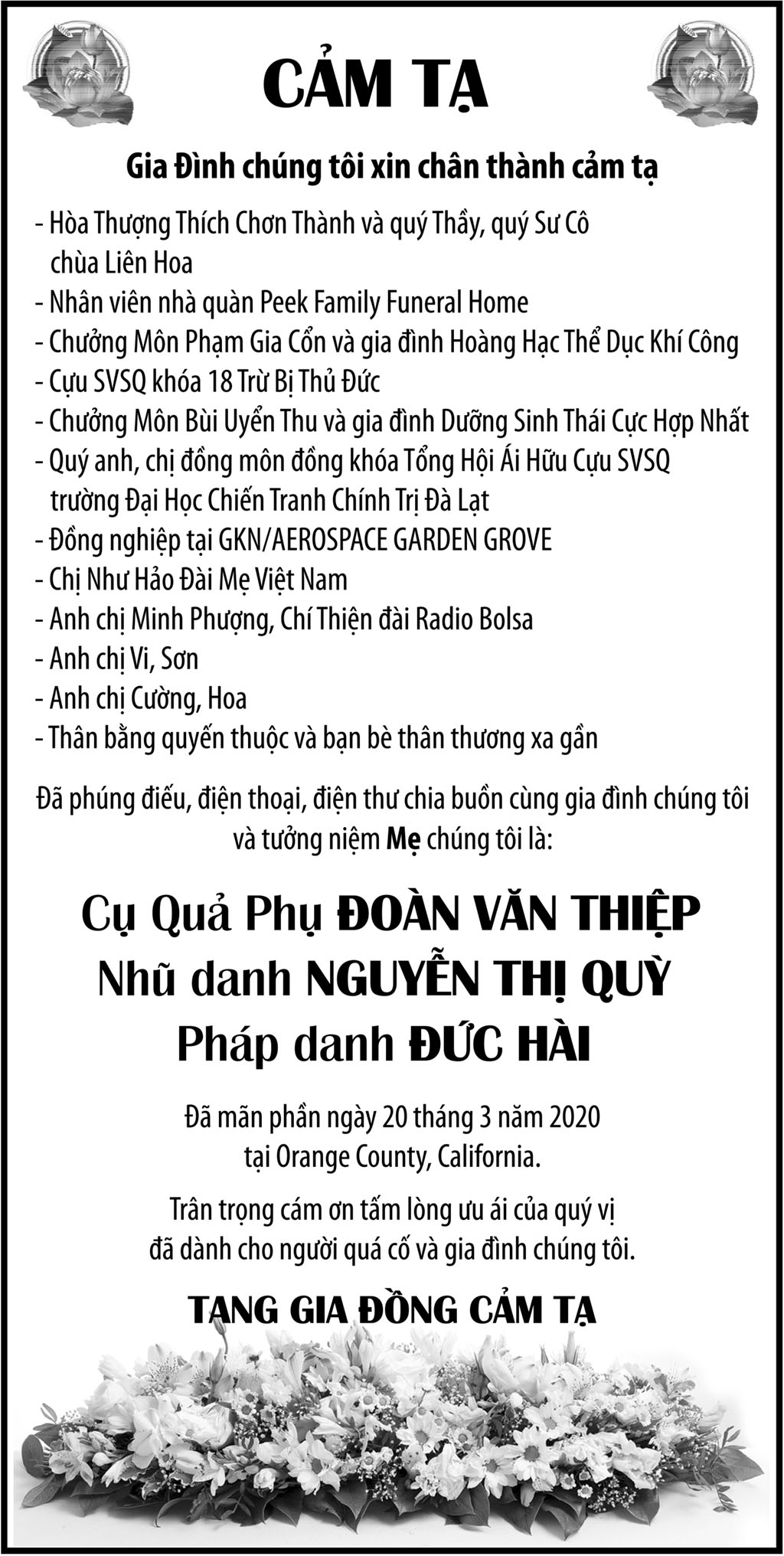 Cụ Quả Phụ Đoàn Văn Thiệp April 3, 2020 : 1:16 PM FacebookXEmailPrint FacebookXEmailPrint CO THE BAN QUAN TAM Luật Sư Nguyễn Xuân Nghĩa April 17, 2026 : 6:36 PM Cụ Ông Phạm Văn Khỏe April 2, 2026 : 6:09 PM Bà Nguyễn Thị Thúy Ban March 30, 2026 : 4:08 PM Bà Quả Phụ Lê Khánh March 27, 2026 : 6:17 PM Ông Lê Thành Long March 13, 2026 : 6:25 PM Bà Bùi Diệu Thanh February 20, 2026 : 5:46 PM Cụ Ông Đào Hữu Tiếu February 6, 2026 : 5:36 PM Bác Sĩ Nguyễn Đình Khôi February 2, 2026 : 5:19 PM [disqus_shortcode_codeable] Cáo Phó Ông Vũ Công Thành April 17, 2026 : 6:34 PM Bác Sĩ Trần Cao Để April 17, 2026 : 6:30 PM Cụ Ông Nguyễn Hữu Thời April 17, 2026 : 6:28 PM Ông Đỗ Duy Đức April 17, 2026 : 6:26 PM Bà Quả Phụ Trần Huyến (nhũ danh Bùi Thị Chi) April 15, 2026 : 7:12 PM Phân Ưu Bà Trần Thị Sâm April 21, 2026 : 6:15 PM Cụ Bà Trần Thị Sâm April 21, 2026 : 6:13 PM Đồng Chí Nguyễn Hữu Thời April 21, 2026 : 6:05 PM Cụ Ông Nguyễn Hữu Thời April 19, 2026 : 7:12 PM Bác Sĩ Trần Cao Đễ April 17, 2026 : 6:38 PM Tưởng Nhớ Huynh Trưởng Du Ca Nguyễn Thiện Cơ January 16, 2026 : 4:54 PM Những buổi tối nơi căn nhà trong hẻm Thành Thái October 19, 2025 : 12:59 PM Doãn Quốc Sỹ, nhà văn, nhà giáo October 19, 2025 : 12:48 PM Nhớ Trưởng Hướng Đạo – Nhà văn Nhật Tiến October 4, 2025 : 5:41 PM Em gái nhạc sĩ Nguyễn Vũ viết về anh trai: Nụ cười hiền hòa... October 2, 2025 : 7:13 PM