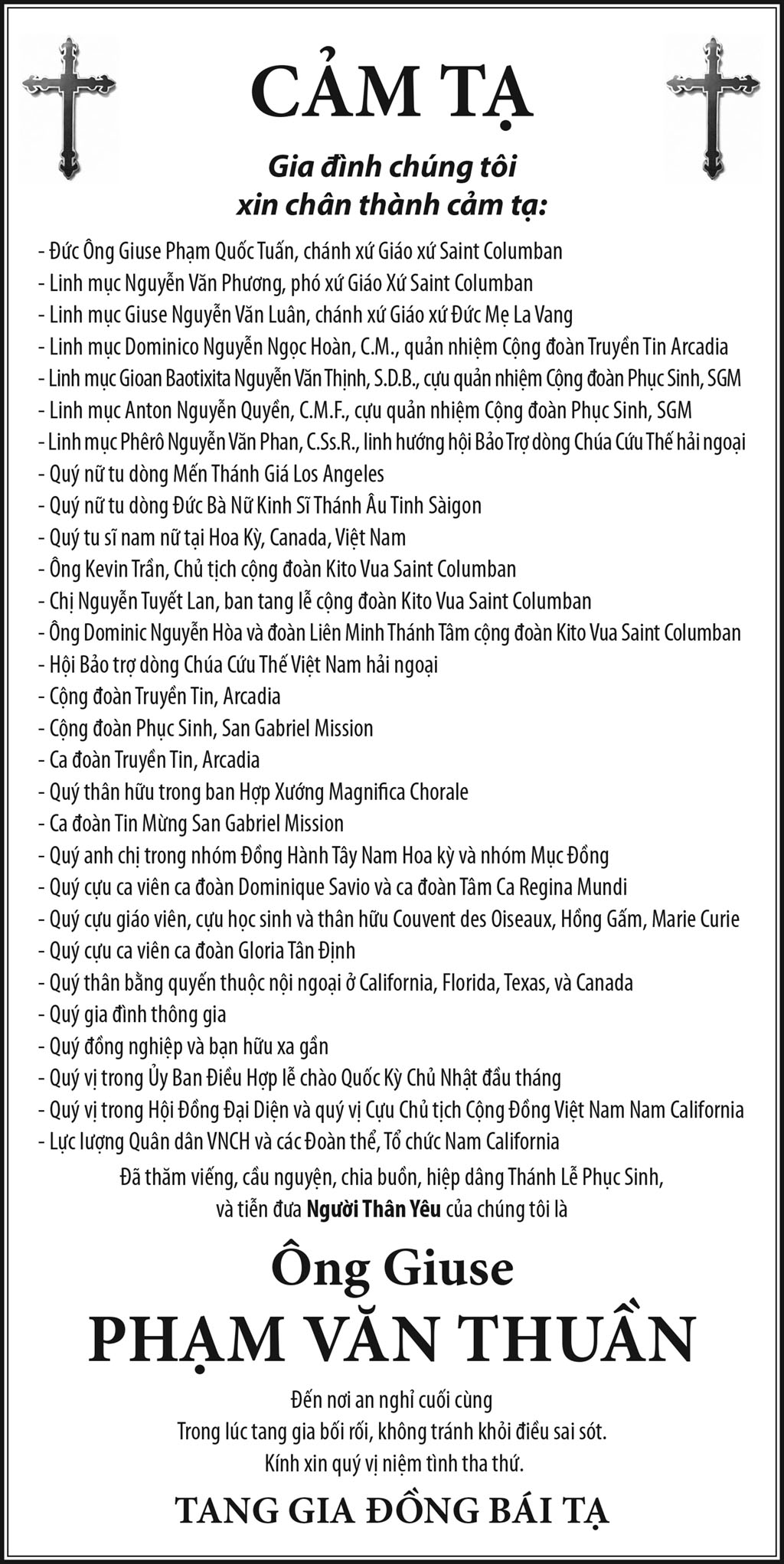 Ông Giuse Phạm Văn Thuần February 15, 2021 : 4:17 PM FacebookXEmailPrint FacebookXEmailPrint CO THE BAN QUAN TAM Luật Sư Nguyễn Xuân Nghĩa April 17, 2026 : 6:36 PM Cụ Ông Phạm Văn Khỏe April 2, 2026 : 6:09 PM Bà Nguyễn Thị Thúy Ban March 30, 2026 : 4:08 PM Bà Quả Phụ Lê Khánh March 27, 2026 : 6:17 PM Ông Lê Thành Long March 13, 2026 : 6:25 PM Bà Bùi Diệu Thanh February 20, 2026 : 5:46 PM Cụ Ông Đào Hữu Tiếu February 6, 2026 : 5:36 PM Bác Sĩ Nguyễn Đình Khôi February 2, 2026 : 5:19 PM [disqus_shortcode_codeable] Cáo Phó Ông Vũ Công Thành April 17, 2026 : 6:34 PM Bác Sĩ Trần Cao Để April 17, 2026 : 6:30 PM Cụ Ông Nguyễn Hữu Thời April 17, 2026 : 6:28 PM Ông Đỗ Duy Đức April 17, 2026 : 6:26 PM Bà Quả Phụ Trần Huyến (nhũ danh Bùi Thị Chi) April 15, 2026 : 7:12 PM Phân Ưu Bà Trần Thị Sâm April 21, 2026 : 6:15 PM Cụ Bà Trần Thị Sâm April 21, 2026 : 6:13 PM Đồng Chí Nguyễn Hữu Thời April 21, 2026 : 6:05 PM Cụ Ông Nguyễn Hữu Thời April 19, 2026 : 7:12 PM Bác Sĩ Trần Cao Đễ April 17, 2026 : 6:38 PM Tưởng Nhớ Huynh Trưởng Du Ca Nguyễn Thiện Cơ January 16, 2026 : 4:54 PM Những buổi tối nơi căn nhà trong hẻm Thành Thái October 19, 2025 : 12:59 PM Doãn Quốc Sỹ, nhà văn, nhà giáo October 19, 2025 : 12:48 PM Nhớ Trưởng Hướng Đạo – Nhà văn Nhật Tiến October 4, 2025 : 5:41 PM Em gái nhạc sĩ Nguyễn Vũ viết về anh trai: Nụ cười hiền hòa... October 2, 2025 : 7:13 PM