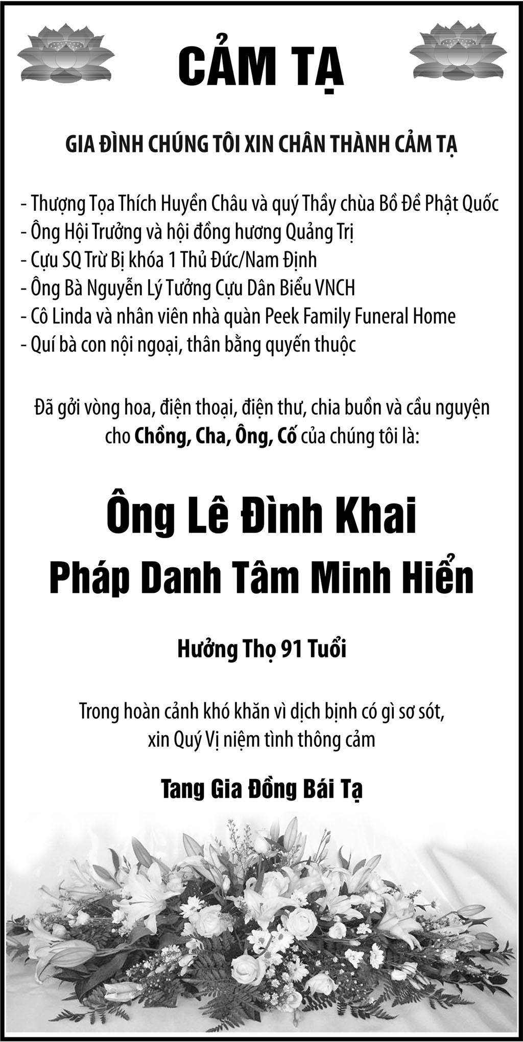 Ông Lê Đình Khai April 10, 2020 : 4:42 PM FacebookXEmailPrint FacebookXEmailPrint CO THE BAN QUAN TAM Luật Sư Nguyễn Xuân Nghĩa April 17, 2026 : 6:36 PM Cụ Ông Phạm Văn Khỏe April 2, 2026 : 6:09 PM Bà Nguyễn Thị Thúy Ban March 30, 2026 : 4:08 PM Bà Quả Phụ Lê Khánh March 27, 2026 : 6:17 PM Ông Lê Thành Long March 13, 2026 : 6:25 PM Bà Bùi Diệu Thanh February 20, 2026 : 5:46 PM Cụ Ông Đào Hữu Tiếu February 6, 2026 : 5:36 PM Bác Sĩ Nguyễn Đình Khôi February 2, 2026 : 5:19 PM [disqus_shortcode_codeable] Cáo Phó Ông Vũ Công Thành April 17, 2026 : 6:34 PM Bác Sĩ Trần Cao Để April 17, 2026 : 6:30 PM Cụ Ông Nguyễn Hữu Thời April 17, 2026 : 6:28 PM Ông Đỗ Duy Đức April 17, 2026 : 6:26 PM Bà Quả Phụ Trần Huyến (nhũ danh Bùi Thị Chi) April 15, 2026 : 7:12 PM Phân Ưu Bà Trần Thị Sâm April 21, 2026 : 6:15 PM Cụ Bà Trần Thị Sâm April 21, 2026 : 6:13 PM Đồng Chí Nguyễn Hữu Thời April 21, 2026 : 6:05 PM Cụ Ông Nguyễn Hữu Thời April 19, 2026 : 7:12 PM Bác Sĩ Trần Cao Đễ April 17, 2026 : 6:38 PM Tưởng Nhớ Huynh Trưởng Du Ca Nguyễn Thiện Cơ January 16, 2026 : 4:54 PM Những buổi tối nơi căn nhà trong hẻm Thành Thái October 19, 2025 : 12:59 PM Doãn Quốc Sỹ, nhà văn, nhà giáo October 19, 2025 : 12:48 PM Nhớ Trưởng Hướng Đạo – Nhà văn Nhật Tiến October 4, 2025 : 5:41 PM Em gái nhạc sĩ Nguyễn Vũ viết về anh trai: Nụ cười hiền hòa... October 2, 2025 : 7:13 PM