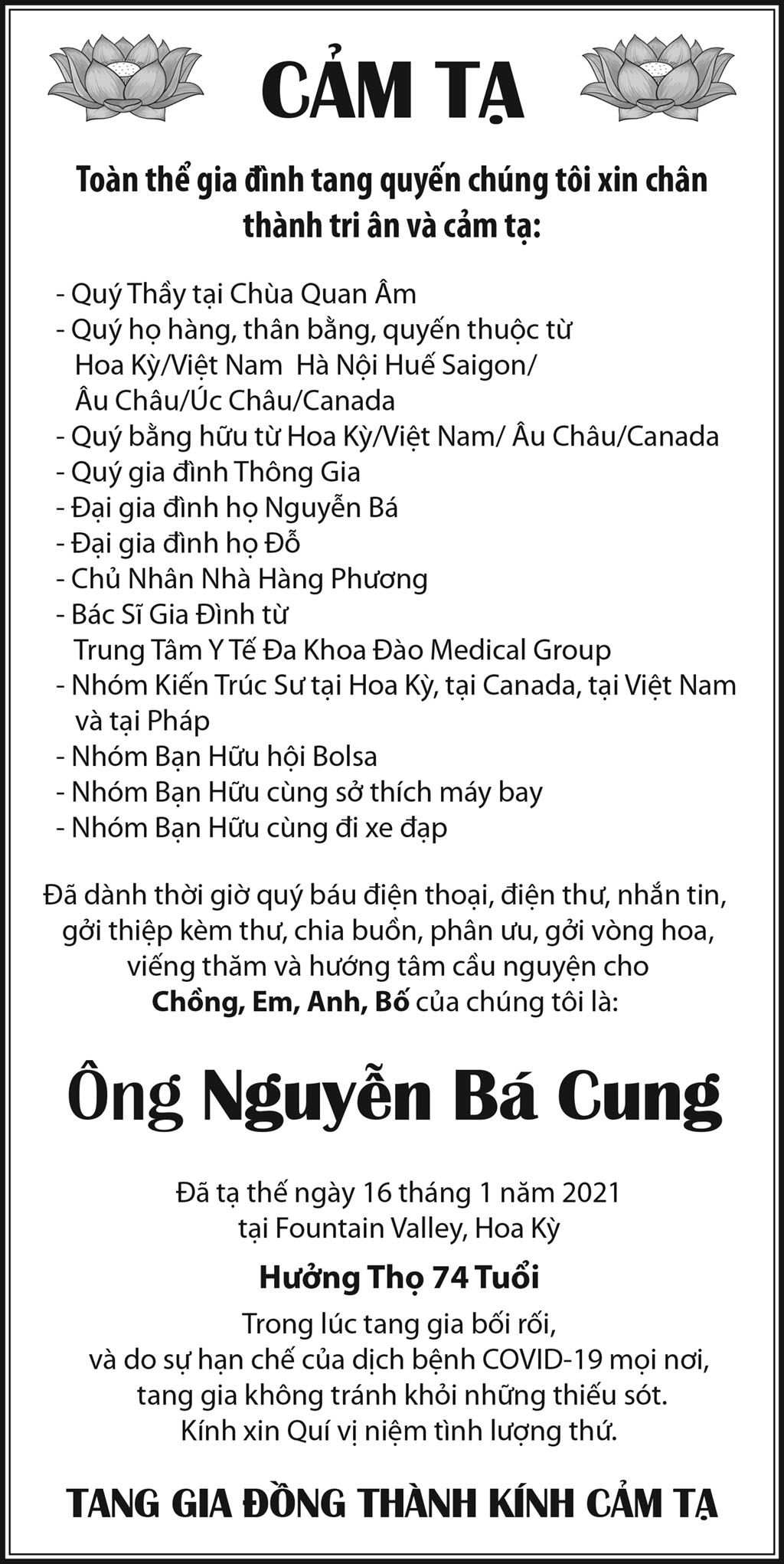 Ông Nguyễn Bá Cung February 19, 2021 : 7:10 PM FacebookXEmailPrint FacebookXEmailPrint CO THE BAN QUAN TAM Luật Sư Nguyễn Xuân Nghĩa April 17, 2026 : 6:36 PM Cụ Ông Phạm Văn Khỏe April 2, 2026 : 6:09 PM Bà Nguyễn Thị Thúy Ban March 30, 2026 : 4:08 PM Bà Quả Phụ Lê Khánh March 27, 2026 : 6:17 PM Ông Lê Thành Long March 13, 2026 : 6:25 PM Bà Bùi Diệu Thanh February 20, 2026 : 5:46 PM Cụ Ông Đào Hữu Tiếu February 6, 2026 : 5:36 PM Bác Sĩ Nguyễn Đình Khôi February 2, 2026 : 5:19 PM [disqus_shortcode_codeable] Cáo Phó Ông Vũ Công Thành April 17, 2026 : 6:34 PM Bác Sĩ Trần Cao Để April 17, 2026 : 6:30 PM Cụ Ông Nguyễn Hữu Thời April 17, 2026 : 6:28 PM Ông Đỗ Duy Đức April 17, 2026 : 6:26 PM Bà Quả Phụ Trần Huyến (nhũ danh Bùi Thị Chi) April 15, 2026 : 7:12 PM Phân Ưu Bà Trần Thị Sâm April 21, 2026 : 6:15 PM Cụ Bà Trần Thị Sâm April 21, 2026 : 6:13 PM Đồng Chí Nguyễn Hữu Thời April 21, 2026 : 6:05 PM Cụ Ông Nguyễn Hữu Thời April 19, 2026 : 7:12 PM Bác Sĩ Trần Cao Đễ April 17, 2026 : 6:38 PM Tưởng Nhớ Huynh Trưởng Du Ca Nguyễn Thiện Cơ January 16, 2026 : 4:54 PM Những buổi tối nơi căn nhà trong hẻm Thành Thái October 19, 2025 : 12:59 PM Doãn Quốc Sỹ, nhà văn, nhà giáo October 19, 2025 : 12:48 PM Nhớ Trưởng Hướng Đạo – Nhà văn Nhật Tiến October 4, 2025 : 5:41 PM Em gái nhạc sĩ Nguyễn Vũ viết về anh trai: Nụ cười hiền hòa... October 2, 2025 : 7:13 PM