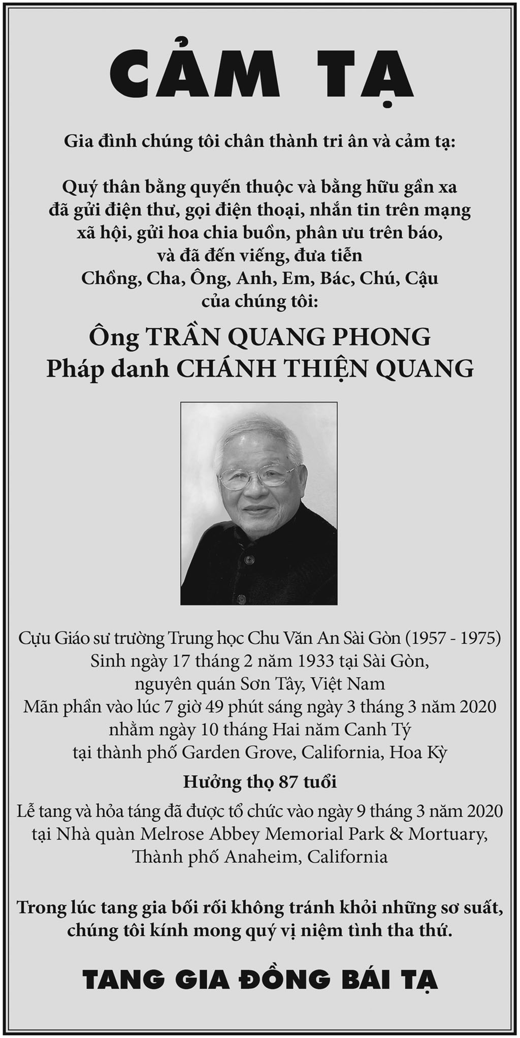 Ông Trần Quang Phong March 13, 2020 : 5:42 PM FacebookXEmailPrint FacebookXEmailPrint CO THE BAN QUAN TAM Luật Sư Nguyễn Xuân Nghĩa April 17, 2026 : 6:36 PM Cụ Ông Phạm Văn Khỏe April 2, 2026 : 6:09 PM Bà Nguyễn Thị Thúy Ban March 30, 2026 : 4:08 PM Bà Quả Phụ Lê Khánh March 27, 2026 : 6:17 PM Ông Lê Thành Long March 13, 2026 : 6:25 PM Bà Bùi Diệu Thanh February 20, 2026 : 5:46 PM Cụ Ông Đào Hữu Tiếu February 6, 2026 : 5:36 PM Bác Sĩ Nguyễn Đình Khôi February 2, 2026 : 5:19 PM [disqus_shortcode_codeable] Cáo Phó Ông Vũ Công Thành April 17, 2026 : 6:34 PM Bác Sĩ Trần Cao Để April 17, 2026 : 6:30 PM Cụ Ông Nguyễn Hữu Thời April 17, 2026 : 6:28 PM Ông Đỗ Duy Đức April 17, 2026 : 6:26 PM Bà Quả Phụ Trần Huyến (nhũ danh Bùi Thị Chi) April 15, 2026 : 7:12 PM Phân Ưu Bà Trần Thị Sâm April 21, 2026 : 6:15 PM Cụ Bà Trần Thị Sâm April 21, 2026 : 6:13 PM Đồng Chí Nguyễn Hữu Thời April 21, 2026 : 6:05 PM Cụ Ông Nguyễn Hữu Thời April 19, 2026 : 7:12 PM Bác Sĩ Trần Cao Đễ April 17, 2026 : 6:38 PM Tưởng Nhớ Huynh Trưởng Du Ca Nguyễn Thiện Cơ January 16, 2026 : 4:54 PM Những buổi tối nơi căn nhà trong hẻm Thành Thái October 19, 2025 : 12:59 PM Doãn Quốc Sỹ, nhà văn, nhà giáo October 19, 2025 : 12:48 PM Nhớ Trưởng Hướng Đạo – Nhà văn Nhật Tiến October 4, 2025 : 5:41 PM Em gái nhạc sĩ Nguyễn Vũ viết về anh trai: Nụ cười hiền hòa... October 2, 2025 : 7:13 PM