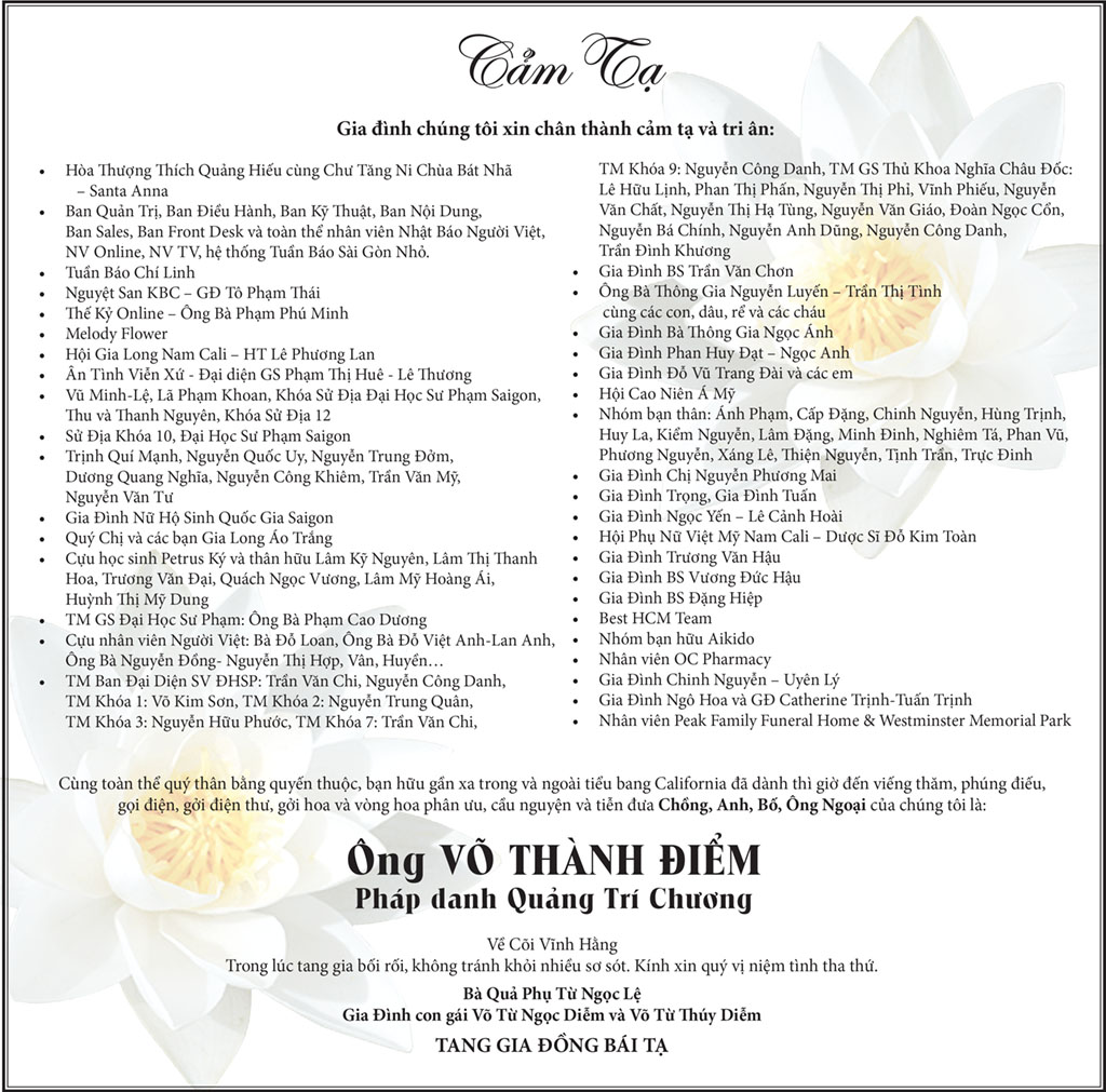 Ông Võ Thành Điểm February 19, 2021 : 7:24 PM FacebookXEmailPrint FacebookXEmailPrint CO THE BAN QUAN TAM Luật Sư Nguyễn Xuân Nghĩa April 17, 2026 : 6:36 PM Cụ Ông Phạm Văn Khỏe April 2, 2026 : 6:09 PM Bà Nguyễn Thị Thúy Ban March 30, 2026 : 4:08 PM Bà Quả Phụ Lê Khánh March 27, 2026 : 6:17 PM Ông Lê Thành Long March 13, 2026 : 6:25 PM Bà Bùi Diệu Thanh February 20, 2026 : 5:46 PM Cụ Ông Đào Hữu Tiếu February 6, 2026 : 5:36 PM Bác Sĩ Nguyễn Đình Khôi February 2, 2026 : 5:19 PM [disqus_shortcode_codeable] Cáo Phó Ông Vũ Công Thành April 17, 2026 : 6:34 PM Bác Sĩ Trần Cao Để April 17, 2026 : 6:30 PM Cụ Ông Nguyễn Hữu Thời April 17, 2026 : 6:28 PM Ông Đỗ Duy Đức April 17, 2026 : 6:26 PM Bà Quả Phụ Trần Huyến (nhũ danh Bùi Thị Chi) April 15, 2026 : 7:12 PM Phân Ưu Bà Trần Thị Sâm April 21, 2026 : 6:15 PM Cụ Bà Trần Thị Sâm April 21, 2026 : 6:13 PM Đồng Chí Nguyễn Hữu Thời April 21, 2026 : 6:05 PM Cụ Ông Nguyễn Hữu Thời April 19, 2026 : 7:12 PM Bác Sĩ Trần Cao Đễ April 17, 2026 : 6:38 PM Tưởng Nhớ Huynh Trưởng Du Ca Nguyễn Thiện Cơ January 16, 2026 : 4:54 PM Những buổi tối nơi căn nhà trong hẻm Thành Thái October 19, 2025 : 12:59 PM Doãn Quốc Sỹ, nhà văn, nhà giáo October 19, 2025 : 12:48 PM Nhớ Trưởng Hướng Đạo – Nhà văn Nhật Tiến October 4, 2025 : 5:41 PM Em gái nhạc sĩ Nguyễn Vũ viết về anh trai: Nụ cười hiền hòa... October 2, 2025 : 7:13 PM
