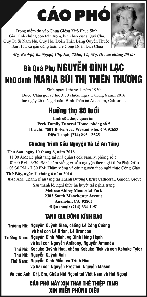 Bà Quả Phụ Nguyễn Đình Lạc June 6, 2016 : 7:09 PM TIN LIÊN QUANMORE FROM AUTHOR Ông Trần Văn Đệ Phật Tử Phạm Đình Mai Ông Nguyễn Văn Đước Bà Lê Thị Như Loan Ông Nguyễn Công Chương Ông Hoàng Thanh Tùng