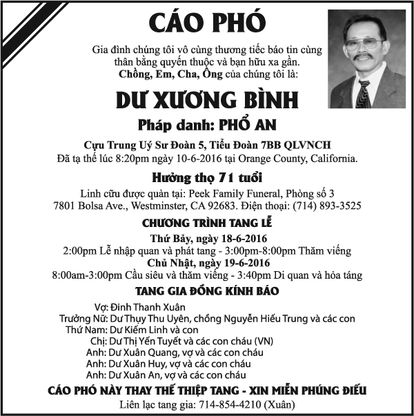 Cáo phó Ông Dư Xương Bình June 14, 2016 : 7:31 PM TIN LIÊN QUANMORE FROM AUTHOR Phật Tử Phạm Đình Mai Ông Nguyễn Văn Đước Bà Lê Thị Như Loan Ông Nguyễn Công Chương Ông Hoàng Thanh Tùng Ông Vũ Công Thành