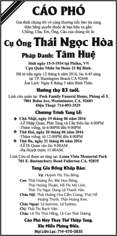 Cụ Ông Thái Ngọc Hòa June 18, 2016 : 6:59 PM TIN LIÊN QUANMORE FROM AUTHOR Phật Tử Phạm Đình Mai Ông Nguyễn Văn Đước Bà Lê Thị Như Loan Ông Nguyễn Công Chương Ông Hoàng Thanh Tùng Ông Vũ Công Thành