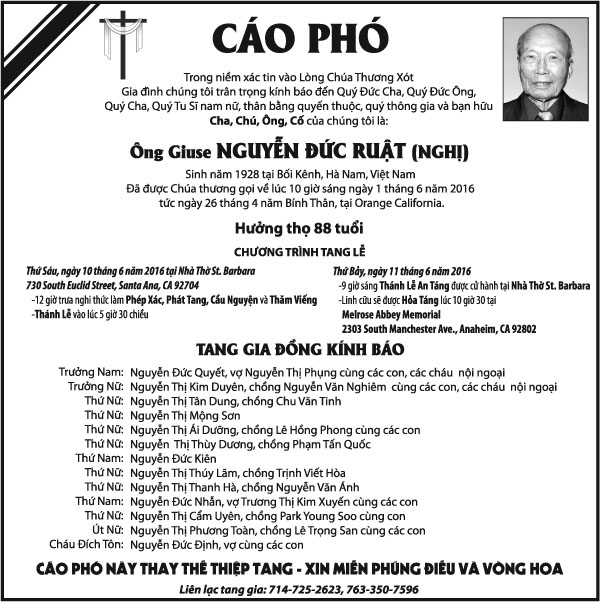 Ông Giuse Nguyễn Đức Ruật (Nghị) June 3, 2016 : 7:17 PM TIN LIÊN QUANMORE FROM AUTHOR Ông Trần Văn Đệ Phật Tử Phạm Đình Mai Ông Nguyễn Văn Đước Bà Lê Thị Như Loan Ông Nguyễn Công Chương Ông Hoàng Thanh Tùng