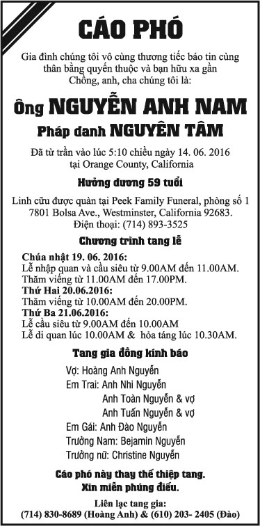 Ông Nguyễn Anh Nam June 16, 2016 : 9:27 PM TIN LIÊN QUANMORE FROM AUTHOR Phật Tử Phạm Đình Mai Ông Nguyễn Văn Đước Bà Lê Thị Như Loan Ông Nguyễn Công Chương Ông Hoàng Thanh Tùng Ông Vũ Công Thành