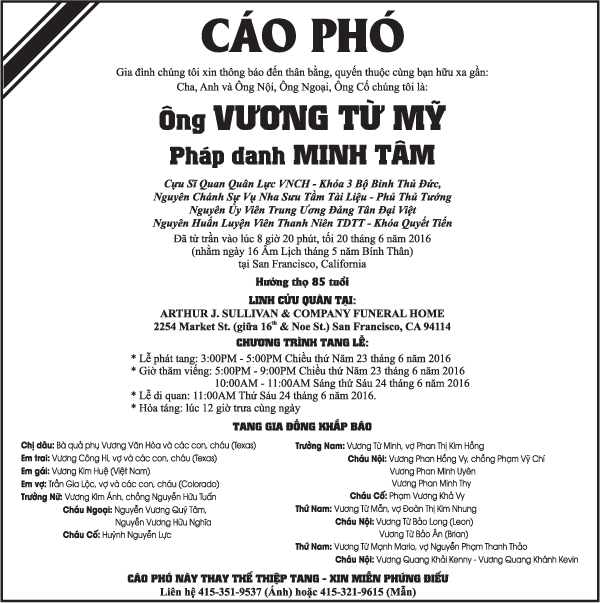 Ông Vương Từ Mỹ June 21, 2016 : 8:08 PM FacebookXEmailPrint FacebookXEmailPrint CO THE BAN QUAN TAM Phật Tử Phạm Đình Mai April 24, 2026 : 7:16 PM Ông Nguyễn Văn Đước April 24, 2026 : 7:14 PM Bà Lê Thị Như Loan April 24, 2026 : 7:13 PM Ông Nguyễn Công Chương April 24, 2026 : 7:08 PM Ông Hoàng Thanh Tùng April 24, 2026 : 6:50 PM Ông Vũ Công Thành April 17, 2026 : 6:34 PM Bác Sĩ Trần Cao Để April 17, 2026 : 6:30 PM Cụ Ông Nguyễn Hữu Thời April 17, 2026 : 6:28 PM [disqus_shortcode_codeable] Phân Ưu Nhà Địa Lý & Tử Vi Thiên Cơ Ông Phạm Đình Mai April 24, 2026 : 7:27 PM Cụ Ông Phạm Đình Mai April 24, 2026 : 7:26 PM Cựu Nữ Sinh TV 58-65 Maria Nguyễn Thị Hồng Tước April 24, 2026 : 7:24 PM Bà Quả Phụ Trần Đức Thụ (Nhũ Danh Maria Nguyễn Thị Hồng Tước) April 24, 2026 : 7:22 PM Bà Trần Thị Sâm April 21, 2026 : 6:15 PM Cảm Tạ Luật Sư Nguyễn Xuân Nghĩa April 17, 2026 : 6:36 PM Cụ Ông Phạm Văn Khỏe April 2, 2026 : 6:09 PM Bà Nguyễn Thị Thúy Ban March 30, 2026 : 4:08 PM Bà Quả Phụ Lê Khánh March 27, 2026 : 6:17 PM Tưởng Nhớ Huynh Trưởng Du Ca Nguyễn Thiện Cơ January 16, 2026 : 4:54 PM Những buổi tối nơi căn nhà trong hẻm Thành Thái October 19, 2025 : 12:59 PM Doãn Quốc Sỹ, nhà văn, nhà giáo October 19, 2025 : 12:48 PM Nhớ Trưởng Hướng Đạo – Nhà văn Nhật Tiến October 4, 2025 : 5:41 PM Em gái nhạc sĩ Nguyễn Vũ viết về anh trai: Nụ cười hiền hòa... October 2, 2025 : 7:13 PM
