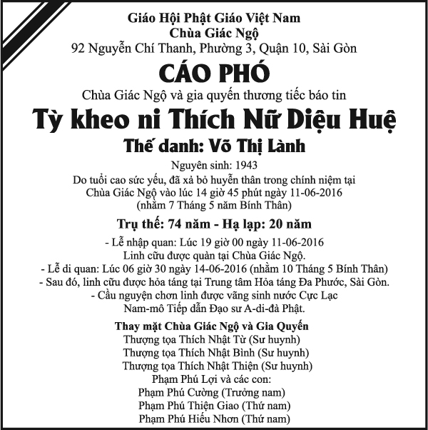 Tỳ kheo ni Thích Nữ Diệu Huệ June 12, 2016 : 5:24 PM TIN LIÊN QUANMORE FROM AUTHOR Phật Tử Phạm Đình Mai Ông Nguyễn Văn Đước Bà Lê Thị Như Loan Ông Nguyễn Công Chương Ông Hoàng Thanh Tùng Ông Vũ Công Thành