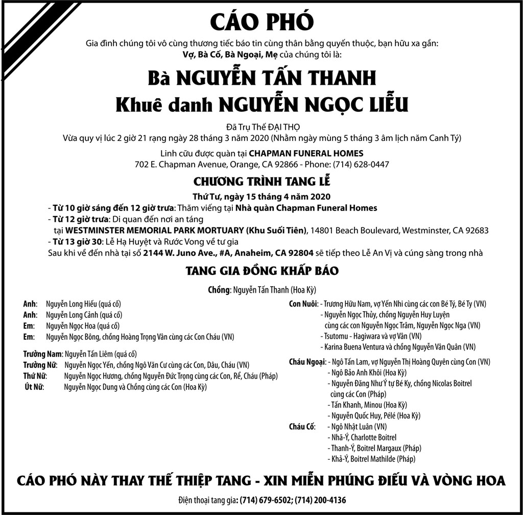 Bà Nguyễn Tấn Thanh April 7, 2020 : 3:45 PM FacebookXEmailPrint FacebookXEmailPrint CO THE BAN QUAN TAM Ông Vũ Công Thành April 17, 2026 : 6:34 PM Bác Sĩ Trần Cao Để April 17, 2026 : 6:30 PM Cụ Ông Nguyễn Hữu Thời April 17, 2026 : 6:28 PM Ông Đỗ Duy Đức April 17, 2026 : 6:26 PM Bà Quả Phụ Trần Huyến (nhũ danh Bùi Thị Chi) April 15, 2026 : 7:12 PM Bà Maria Châu Kim Loan April 15, 2026 : 7:10 PM Ông Phanxicô Xaviê Vũ Đình Khang April 14, 2026 : 7:11 PM Bà Ngạc Thị Sơn April 14, 2026 : 7:09 PM [disqus_shortcode_codeable] Phân Ưu Bà Trần Thị Sâm April 21, 2026 : 6:15 PM Cụ Bà Trần Thị Sâm April 21, 2026 : 6:13 PM Đồng Chí Nguyễn Hữu Thời April 21, 2026 : 6:05 PM Cụ Ông Nguyễn Hữu Thời April 19, 2026 : 7:12 PM Bác Sĩ Trần Cao Đễ April 17, 2026 : 6:38 PM Cảm Tạ Luật Sư Nguyễn Xuân Nghĩa April 17, 2026 : 6:36 PM Cụ Ông Phạm Văn Khỏe April 2, 2026 : 6:09 PM Bà Nguyễn Thị Thúy Ban March 30, 2026 : 4:08 PM Bà Quả Phụ Lê Khánh March 27, 2026 : 6:17 PM Tưởng Nhớ Huynh Trưởng Du Ca Nguyễn Thiện Cơ January 16, 2026 : 4:54 PM Những buổi tối nơi căn nhà trong hẻm Thành Thái October 19, 2025 : 12:59 PM Doãn Quốc Sỹ, nhà văn, nhà giáo October 19, 2025 : 12:48 PM Nhớ Trưởng Hướng Đạo – Nhà văn Nhật Tiến October 4, 2025 : 5:41 PM Em gái nhạc sĩ Nguyễn Vũ viết về anh trai: Nụ cười hiền hòa... October 2, 2025 : 7:13 PM