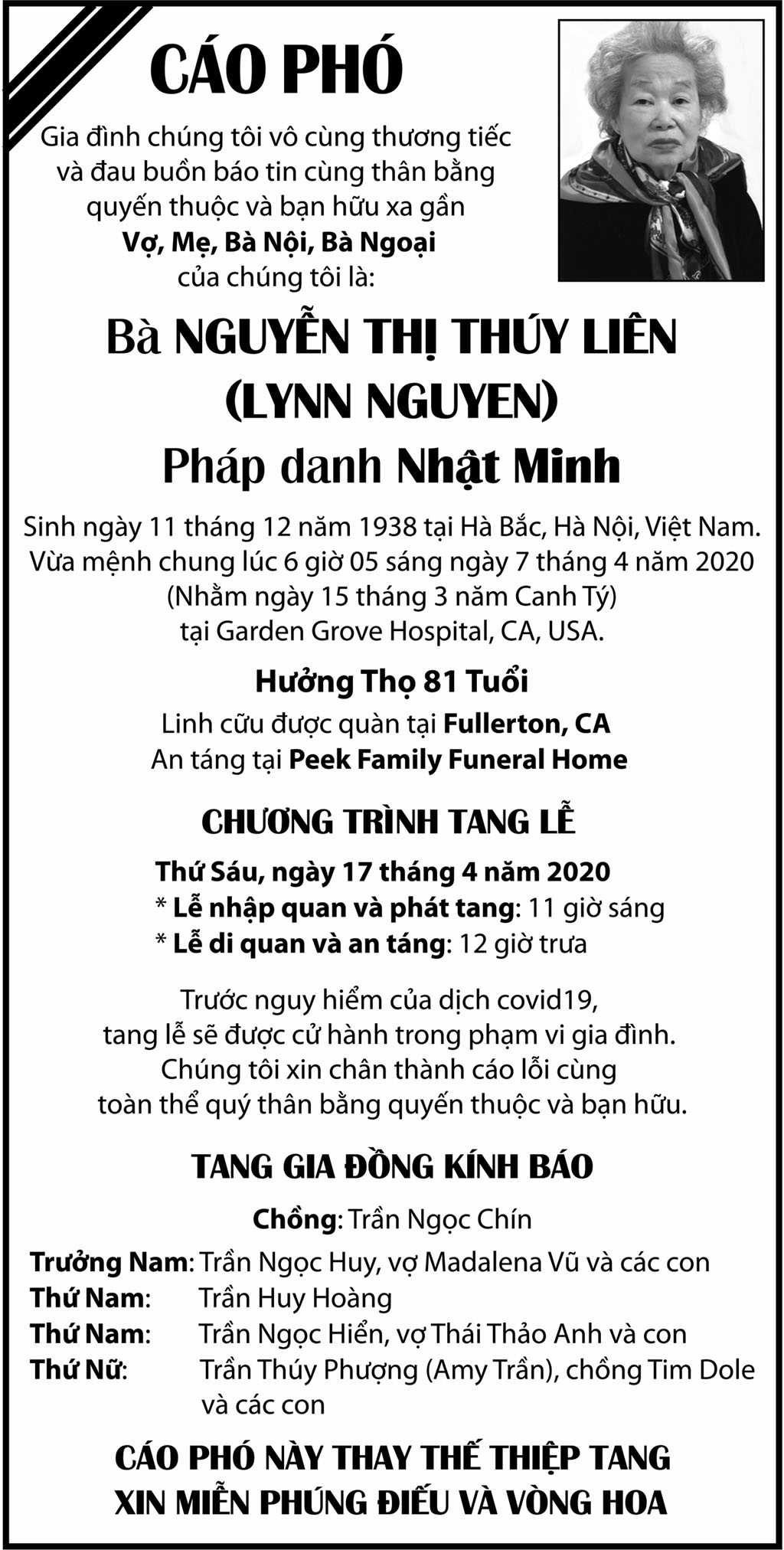 Bà Nguyễn Thị Thúy Liên (Lynn Nguyen) April 10, 2020 : 4:49 PM FacebookXEmailPrint FacebookXEmailPrint CO THE BAN QUAN TAM Ông Vũ Công Thành April 17, 2026 : 6:34 PM Bác Sĩ Trần Cao Để April 17, 2026 : 6:30 PM Cụ Ông Nguyễn Hữu Thời April 17, 2026 : 6:28 PM Ông Đỗ Duy Đức April 17, 2026 : 6:26 PM Bà Quả Phụ Trần Huyến (nhũ danh Bùi Thị Chi) April 15, 2026 : 7:12 PM Bà Maria Châu Kim Loan April 15, 2026 : 7:10 PM Ông Phanxicô Xaviê Vũ Đình Khang April 14, 2026 : 7:11 PM Bà Ngạc Thị Sơn April 14, 2026 : 7:09 PM [disqus_shortcode_codeable] Phân Ưu Bà Trần Thị Sâm April 21, 2026 : 6:15 PM Cụ Bà Trần Thị Sâm April 21, 2026 : 6:13 PM Đồng Chí Nguyễn Hữu Thời April 21, 2026 : 6:05 PM Cụ Ông Nguyễn Hữu Thời April 19, 2026 : 7:12 PM Bác Sĩ Trần Cao Đễ April 17, 2026 : 6:38 PM Cảm Tạ Luật Sư Nguyễn Xuân Nghĩa April 17, 2026 : 6:36 PM Cụ Ông Phạm Văn Khỏe April 2, 2026 : 6:09 PM Bà Nguyễn Thị Thúy Ban March 30, 2026 : 4:08 PM Bà Quả Phụ Lê Khánh March 27, 2026 : 6:17 PM Tưởng Nhớ Huynh Trưởng Du Ca Nguyễn Thiện Cơ January 16, 2026 : 4:54 PM Những buổi tối nơi căn nhà trong hẻm Thành Thái October 19, 2025 : 12:59 PM Doãn Quốc Sỹ, nhà văn, nhà giáo October 19, 2025 : 12:48 PM Nhớ Trưởng Hướng Đạo – Nhà văn Nhật Tiến October 4, 2025 : 5:41 PM Em gái nhạc sĩ Nguyễn Vũ viết về anh trai: Nụ cười hiền hòa... October 2, 2025 : 7:13 PM