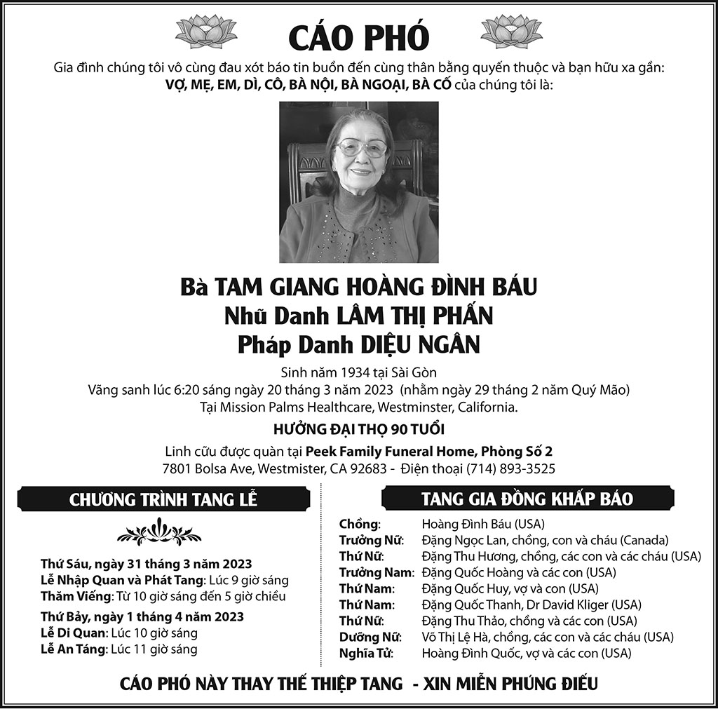 Bà Tam Giang Hoàng Đình Báu (nhũ danh Lâm Thị Phấn) March 24, 2023 : 6:49 PM FacebookXEmailPrint FacebookXEmailPrint CO THE BAN QUAN TAM Ông Martino Bùi Duy Tân April 29, 2026 : 7:02 PM Ông Trần Văn Đệ April 27, 2026 : 7:15 PM Phật Tử Phạm Đình Mai April 24, 2026 : 7:16 PM Ông Nguyễn Văn Đước April 24, 2026 : 7:14 PM Bà Lê Thị Như Loan April 24, 2026 : 7:13 PM Ông Nguyễn Công Chương April 24, 2026 : 7:08 PM Ông Hoàng Thanh Tùng April 24, 2026 : 6:50 PM Ông Vũ Công Thành April 17, 2026 : 6:34 PM [disqus_shortcode_codeable] Phân Ưu Bạn Giuse Đào Đức Long April 29, 2026 : 7:03 PM Bà Lê Thị Như Loan April 27, 2026 : 7:16 PM Maria Nguyễn Thị Hồng Tước (3) April 25, 2026 : 7:30 PM Maria Nguyễn Thị Hồng Tước (1) April 25, 2026 : 7:26 PM Maria Nguyễn Thị Hồng Tước (2) April 25, 2026 : 7:24 PM Cảm Tạ Luật Sư Nguyễn Xuân Nghĩa April 17, 2026 : 6:36 PM Cụ Ông Phạm Văn Khỏe April 2, 2026 : 6:09 PM Bà Nguyễn Thị Thúy Ban March 30, 2026 : 4:08 PM Bà Quả Phụ Lê Khánh March 27, 2026 : 6:17 PM Tưởng Nhớ Ca sĩ Hồng Tước April 25, 2026 : 2:00 PM Huynh Trưởng Du Ca Nguyễn Thiện Cơ January 16, 2026 : 4:54 PM Những buổi tối nơi căn nhà trong hẻm Thành Thái October 19, 2025 : 12:59 PM Doãn Quốc Sỹ, nhà văn, nhà giáo October 19, 2025 : 12:48 PM Nhớ Trưởng Hướng Đạo – Nhà văn Nhật Tiến October 4, 2025 : 5:41 PM