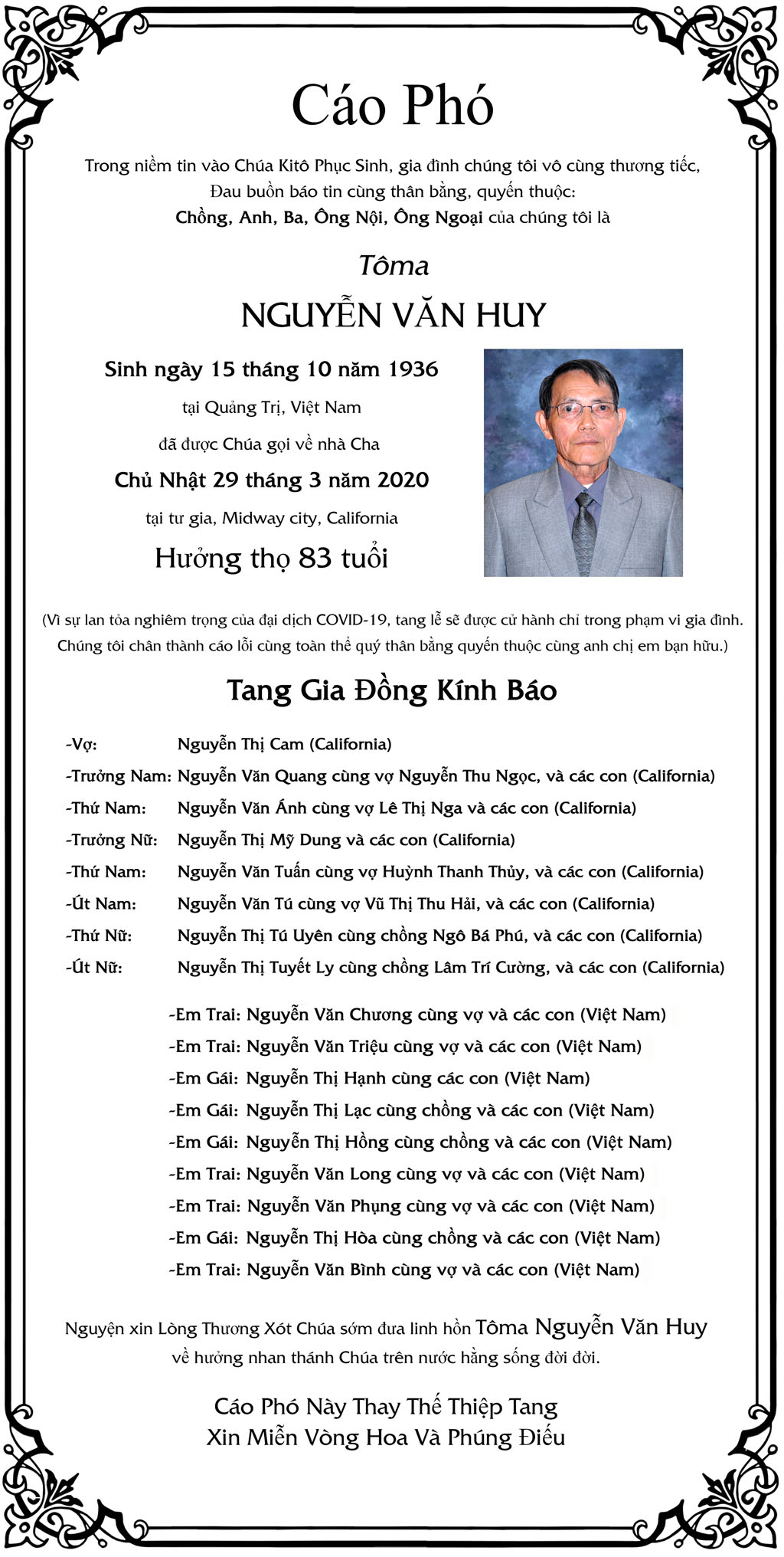 Tôma Nguyễn Văn Huy March 31, 2020 : 4:41 PM FacebookXEmailPrint FacebookXEmailPrint CO THE BAN QUAN TAM Ông Vũ Công Thành April 17, 2026 : 6:34 PM Bác Sĩ Trần Cao Để April 17, 2026 : 6:30 PM Cụ Ông Nguyễn Hữu Thời April 17, 2026 : 6:28 PM Ông Đỗ Duy Đức April 17, 2026 : 6:26 PM Bà Quả Phụ Trần Huyến (nhũ danh Bùi Thị Chi) April 15, 2026 : 7:12 PM Bà Maria Châu Kim Loan April 15, 2026 : 7:10 PM Ông Phanxicô Xaviê Vũ Đình Khang April 14, 2026 : 7:11 PM Bà Ngạc Thị Sơn April 14, 2026 : 7:09 PM [disqus_shortcode_codeable] Phân Ưu Bà Trần Thị Sâm April 21, 2026 : 6:15 PM Cụ Bà Trần Thị Sâm April 21, 2026 : 6:13 PM Đồng Chí Nguyễn Hữu Thời April 21, 2026 : 6:05 PM Cụ Ông Nguyễn Hữu Thời April 19, 2026 : 7:12 PM Bác Sĩ Trần Cao Đễ April 17, 2026 : 6:38 PM Cảm Tạ Luật Sư Nguyễn Xuân Nghĩa April 17, 2026 : 6:36 PM Cụ Ông Phạm Văn Khỏe April 2, 2026 : 6:09 PM Bà Nguyễn Thị Thúy Ban March 30, 2026 : 4:08 PM Bà Quả Phụ Lê Khánh March 27, 2026 : 6:17 PM Tưởng Nhớ Huynh Trưởng Du Ca Nguyễn Thiện Cơ January 16, 2026 : 4:54 PM Những buổi tối nơi căn nhà trong hẻm Thành Thái October 19, 2025 : 12:59 PM Doãn Quốc Sỹ, nhà văn, nhà giáo October 19, 2025 : 12:48 PM Nhớ Trưởng Hướng Đạo – Nhà văn Nhật Tiến October 4, 2025 : 5:41 PM Em gái nhạc sĩ Nguyễn Vũ viết về anh trai: Nụ cười hiền hòa... October 2, 2025 : 7:13 PM