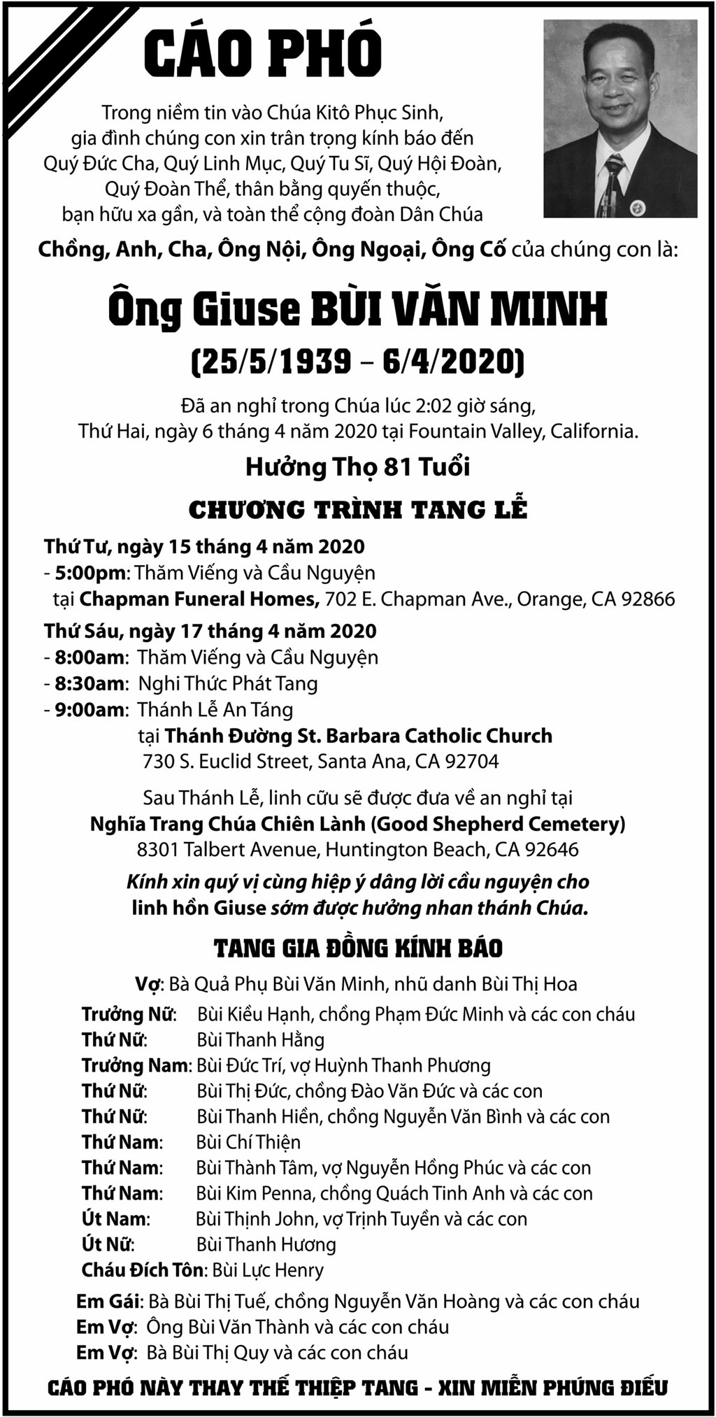 Ông Giuse Bùi Văn Minh April 10, 2020 : 4:57 PM FacebookXEmailPrint FacebookXEmailPrint CO THE BAN QUAN TAM Ông Vũ Công Thành April 17, 2026 : 6:34 PM Bác Sĩ Trần Cao Để April 17, 2026 : 6:30 PM Cụ Ông Nguyễn Hữu Thời April 17, 2026 : 6:28 PM Ông Đỗ Duy Đức April 17, 2026 : 6:26 PM Bà Quả Phụ Trần Huyến (nhũ danh Bùi Thị Chi) April 15, 2026 : 7:12 PM Bà Maria Châu Kim Loan April 15, 2026 : 7:10 PM Ông Phanxicô Xaviê Vũ Đình Khang April 14, 2026 : 7:11 PM Bà Ngạc Thị Sơn April 14, 2026 : 7:09 PM [disqus_shortcode_codeable] Phân Ưu Bà Trần Thị Sâm April 21, 2026 : 6:15 PM Cụ Bà Trần Thị Sâm April 21, 2026 : 6:13 PM Đồng Chí Nguyễn Hữu Thời April 21, 2026 : 6:05 PM Cụ Ông Nguyễn Hữu Thời April 19, 2026 : 7:12 PM Bác Sĩ Trần Cao Đễ April 17, 2026 : 6:38 PM Cảm Tạ Luật Sư Nguyễn Xuân Nghĩa April 17, 2026 : 6:36 PM Cụ Ông Phạm Văn Khỏe April 2, 2026 : 6:09 PM Bà Nguyễn Thị Thúy Ban March 30, 2026 : 4:08 PM Bà Quả Phụ Lê Khánh March 27, 2026 : 6:17 PM Tưởng Nhớ Huynh Trưởng Du Ca Nguyễn Thiện Cơ January 16, 2026 : 4:54 PM Những buổi tối nơi căn nhà trong hẻm Thành Thái October 19, 2025 : 12:59 PM Doãn Quốc Sỹ, nhà văn, nhà giáo October 19, 2025 : 12:48 PM Nhớ Trưởng Hướng Đạo – Nhà văn Nhật Tiến October 4, 2025 : 5:41 PM Em gái nhạc sĩ Nguyễn Vũ viết về anh trai: Nụ cười hiền hòa... October 2, 2025 : 7:13 PM