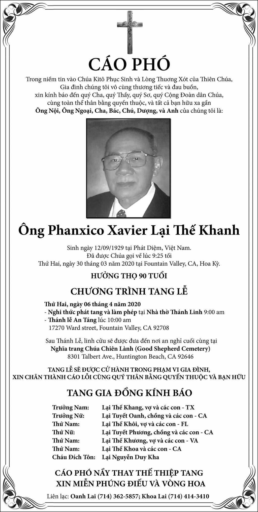 Ông Phanxico Xavier Lại Thế Khanh April 2, 2020 : 4:56 PM FacebookXEmailPrint FacebookXEmailPrint CO THE BAN QUAN TAM Ông Vũ Công Thành April 17, 2026 : 6:34 PM Bác Sĩ Trần Cao Để April 17, 2026 : 6:30 PM Cụ Ông Nguyễn Hữu Thời April 17, 2026 : 6:28 PM Ông Đỗ Duy Đức April 17, 2026 : 6:26 PM Bà Quả Phụ Trần Huyến (nhũ danh Bùi Thị Chi) April 15, 2026 : 7:12 PM Bà Maria Châu Kim Loan April 15, 2026 : 7:10 PM Ông Phanxicô Xaviê Vũ Đình Khang April 14, 2026 : 7:11 PM Bà Ngạc Thị Sơn April 14, 2026 : 7:09 PM [disqus_shortcode_codeable] Phân Ưu Bà Trần Thị Sâm April 21, 2026 : 6:15 PM Cụ Bà Trần Thị Sâm April 21, 2026 : 6:13 PM Đồng Chí Nguyễn Hữu Thời April 21, 2026 : 6:05 PM Cụ Ông Nguyễn Hữu Thời April 19, 2026 : 7:12 PM Bác Sĩ Trần Cao Đễ April 17, 2026 : 6:38 PM Cảm Tạ Luật Sư Nguyễn Xuân Nghĩa April 17, 2026 : 6:36 PM Cụ Ông Phạm Văn Khỏe April 2, 2026 : 6:09 PM Bà Nguyễn Thị Thúy Ban March 30, 2026 : 4:08 PM Bà Quả Phụ Lê Khánh March 27, 2026 : 6:17 PM Tưởng Nhớ Huynh Trưởng Du Ca Nguyễn Thiện Cơ January 16, 2026 : 4:54 PM Những buổi tối nơi căn nhà trong hẻm Thành Thái October 19, 2025 : 12:59 PM Doãn Quốc Sỹ, nhà văn, nhà giáo October 19, 2025 : 12:48 PM Nhớ Trưởng Hướng Đạo – Nhà văn Nhật Tiến October 4, 2025 : 5:41 PM Em gái nhạc sĩ Nguyễn Vũ viết về anh trai: Nụ cười hiền hòa... October 2, 2025 : 7:13 PM
