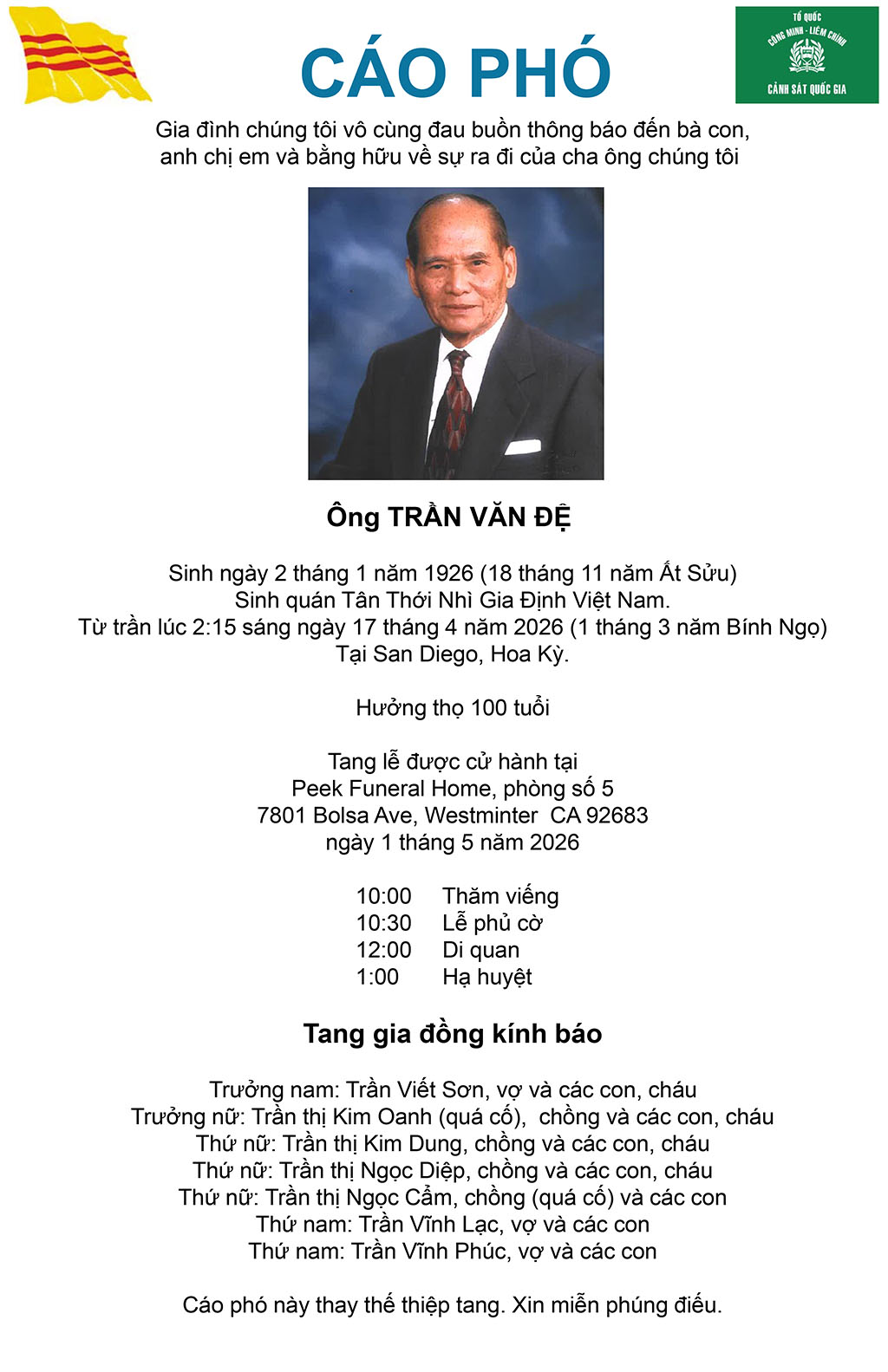 Ông Trần Văn Đệ April 27, 2026 : 7:15 PM FacebookXEmailPrint FacebookXEmailPrint CO THE BAN QUAN TAM Phật Tử Phạm Đình Mai April 24, 2026 : 7:16 PM Ông Nguyễn Văn Đước April 24, 2026 : 7:14 PM Bà Lê Thị Như Loan April 24, 2026 : 7:13 PM Ông Nguyễn Công Chương April 24, 2026 : 7:08 PM Ông Hoàng Thanh Tùng April 24, 2026 : 6:50 PM Ông Vũ Công Thành April 17, 2026 : 6:34 PM Bác Sĩ Trần Cao Để April 17, 2026 : 6:30 PM Cụ Ông Nguyễn Hữu Thời April 17, 2026 : 6:28 PM [disqus_shortcode_codeable] Phân Ưu Bà Lê Thị Như Loan April 27, 2026 : 7:16 PM Maria Nguyễn Thị Hồng Tước (3) April 25, 2026 : 7:30 PM Maria Nguyễn Thị Hồng Tước (1) April 25, 2026 : 7:26 PM Maria Nguyễn Thị Hồng Tước (2) April 25, 2026 : 7:24 PM Nhà Địa Lý & Tử Vi Thiên Cơ Ông Phạm Đình Mai April 24, 2026 : 7:27 PM Cảm Tạ Luật Sư Nguyễn Xuân Nghĩa April 17, 2026 : 6:36 PM Cụ Ông Phạm Văn Khỏe April 2, 2026 : 6:09 PM Bà Nguyễn Thị Thúy Ban March 30, 2026 : 4:08 PM Bà Quả Phụ Lê Khánh March 27, 2026 : 6:17 PM Tưởng Nhớ Ca sĩ Hồng Tước April 25, 2026 : 2:00 PM Huynh Trưởng Du Ca Nguyễn Thiện Cơ January 16, 2026 : 4:54 PM Những buổi tối nơi căn nhà trong hẻm Thành Thái October 19, 2025 : 12:59 PM Doãn Quốc Sỹ, nhà văn, nhà giáo October 19, 2025 : 12:48 PM Nhớ Trưởng Hướng Đạo – Nhà văn Nhật Tiến October 4, 2025 : 5:41 PM