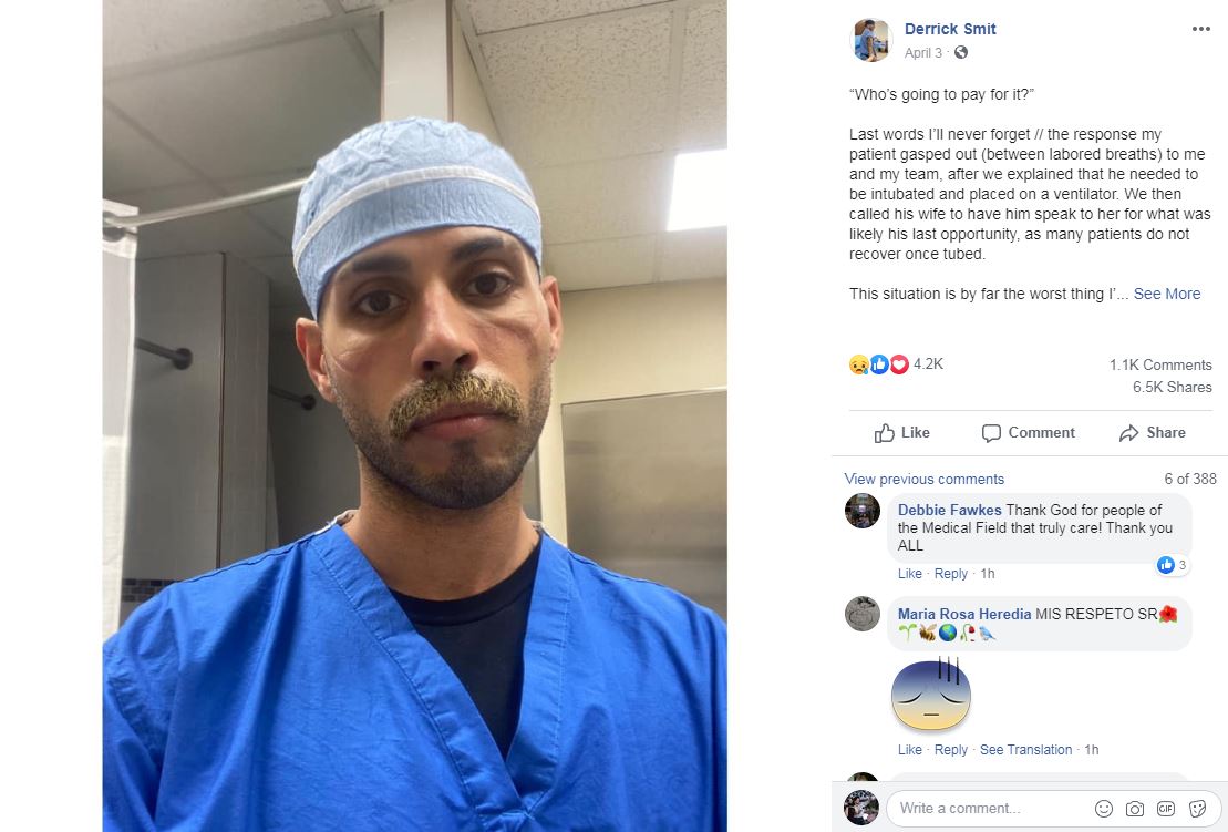 “Tôi không lạ với những cảnh tượng khủng khiếp trước cái chết tại bệnh viện, nhưng đây là câu nói làm tôi chấn động bàng hoàng,” ông Derrick Smith, chuyên viên gây mê tại một bệnh viện ở thành phố New York, kể lại với CNN.