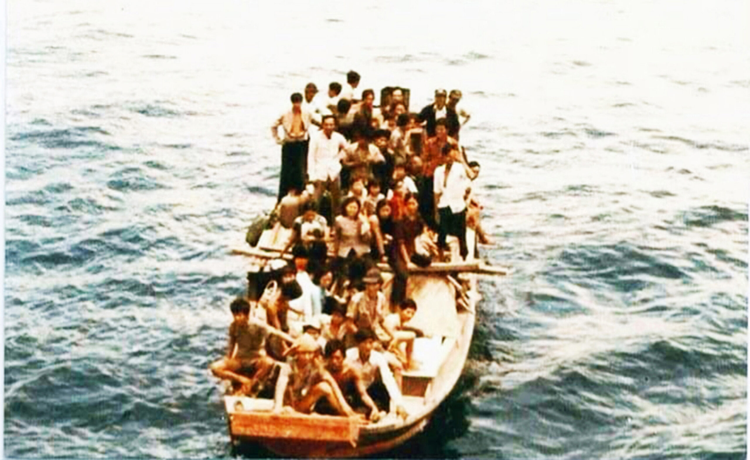 “Trẻ em và phụ nữ được lên tàu lớn trước rồi sau đó mới đến thanh niên và đàn ông. Khi tất cả mọi người được lên tàu lớn, họ cho chúng tôi tập trung một nơi đã định vị. Rồi sau đó chúng tôi được họ đưa đi tắm rửa, sát trùng và phát đồ mới cho mọi người, và có nhiều nhân viên y tế đến khám sức khỏe và trị bệnh cho chúng tôi. Cùng lúc đó, có một thủy thủ đã chụp hình chiếc ghe vượt biên của chúng tôi, và anh này tặng hình này cho một người trên ghe chúng tôi và giữ đến ngày nay. Sau đó, theo luật, hạm trưởng xin phép phá hủy chiếc ghe. Thật xúc động có nhiều người đã khóc khi chiếc ghe bị bắn và chìm dần rồi mất hút xuống đại dương. Hình ảnh đó sau 45 năm lưu vong đối với tôi vẫn không xóa mờ,” ông nói tiếp.