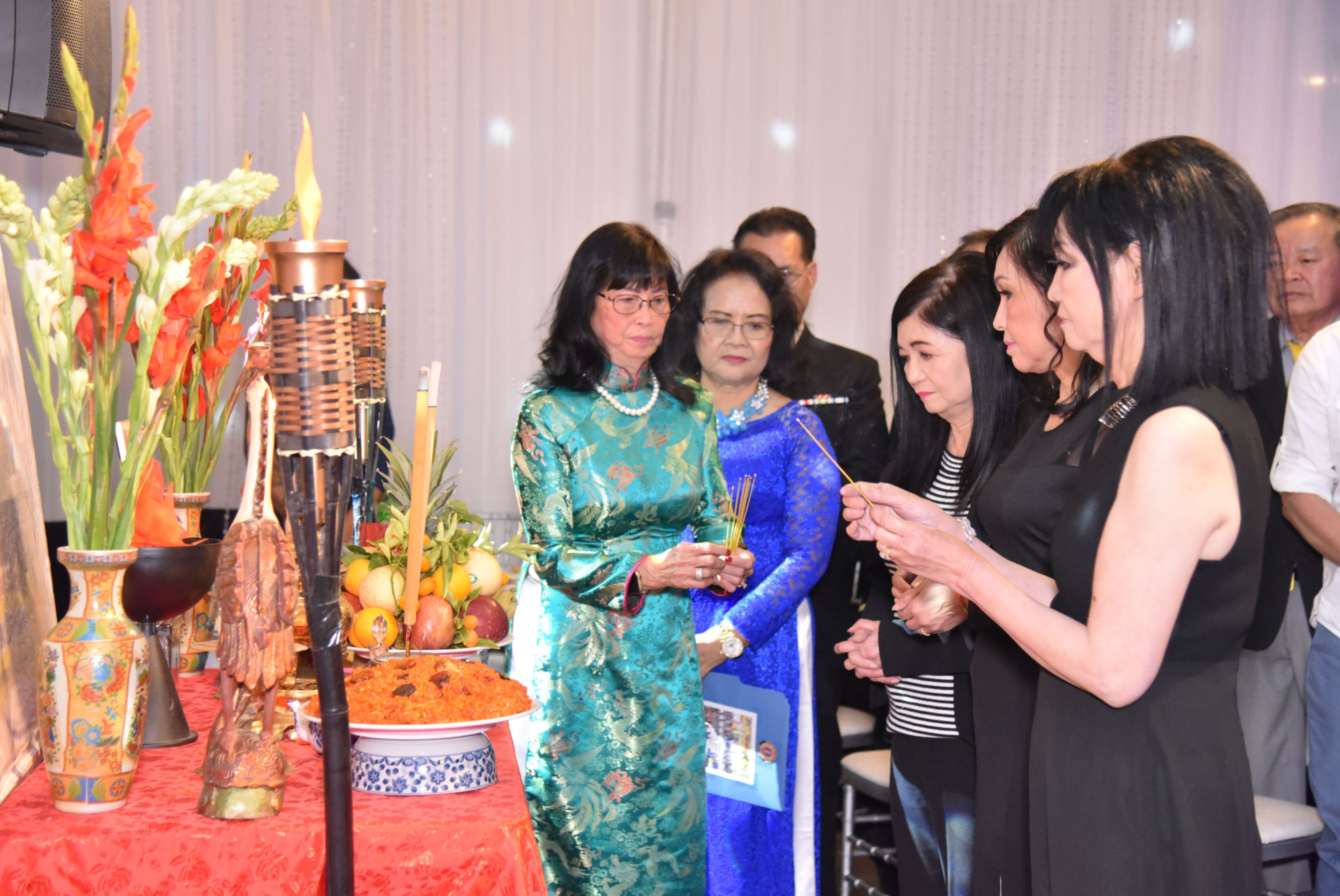 Trên sân khấu, bên phải là bàn thờ tổ quốc với lá cờ vàng trong đó có di ảnh của cố Đại Tá Trần Ngọc Thống, Khóa 1 Nam Định, cựu SVSQ kỳ cựu xuất thân từ trường Bộ Binh Thủ Đức vừa ra đi vĩnh viễn.