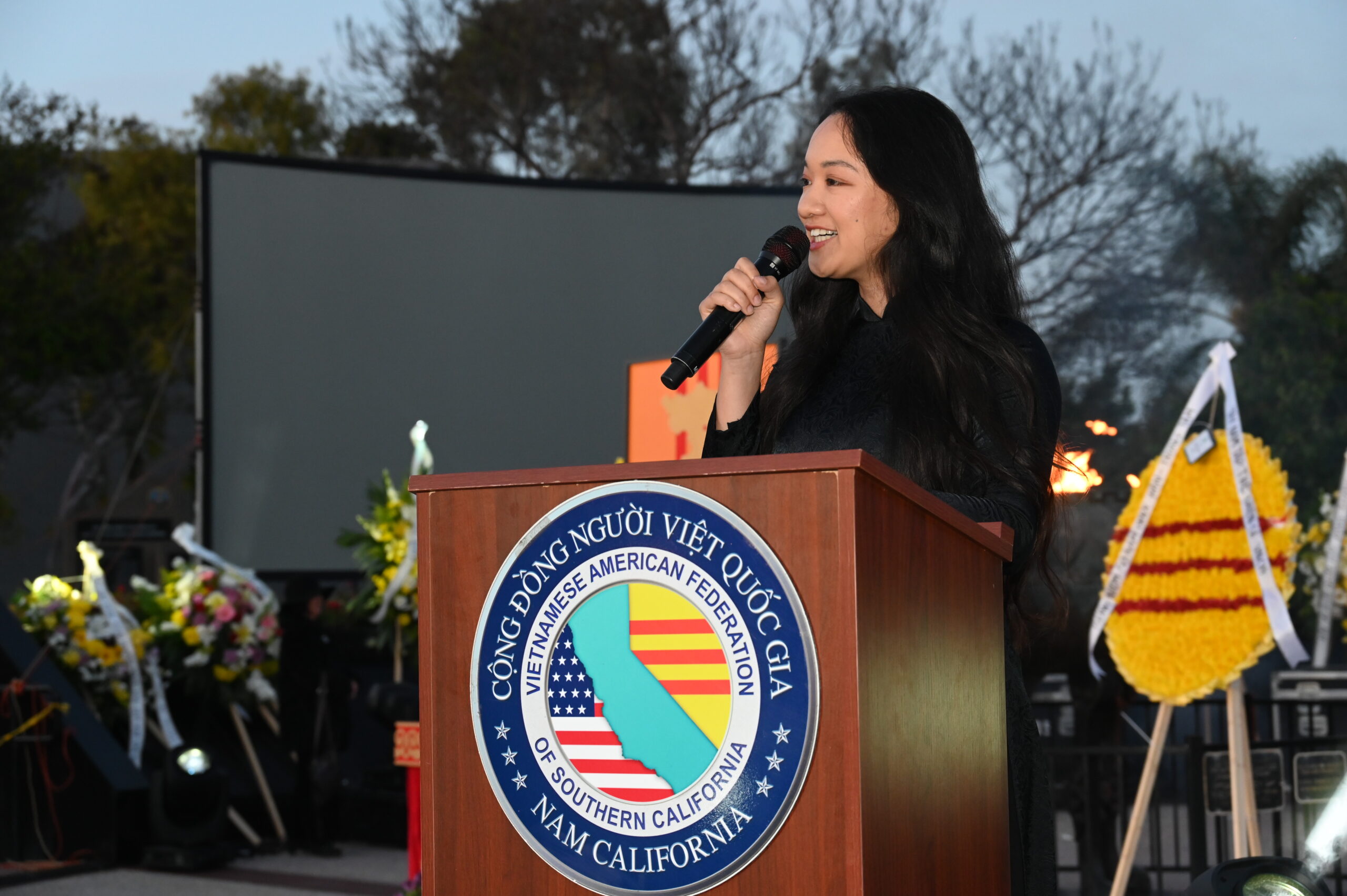Tiếp đến, sinh viên Jolynna Đặng, đại diện Tổng Hội Sinh Viên Việt Nam Miền Nam California, với tư cách là thế hệ người Việt thứ ba sinh ra ở Mỹ, xin thưa với tất cả các cô, chú, bác, ông bà đang có mặt rằng dù nói tiếng Việt không giỏi, không phải trải qua những đau thương như quý ông bà cô chú, không thể hiểu hết những hy sinh to lớn quý vị đã trải qua, nhưng cô “học được những điều cao quý tốt đẹp về lòng biết ơn, sự hy sinh và tinh thần đoàn kết, dù con sinh ra và lớn lên ở Mỹ, nhưng không quên mình là người Việt Nam.”