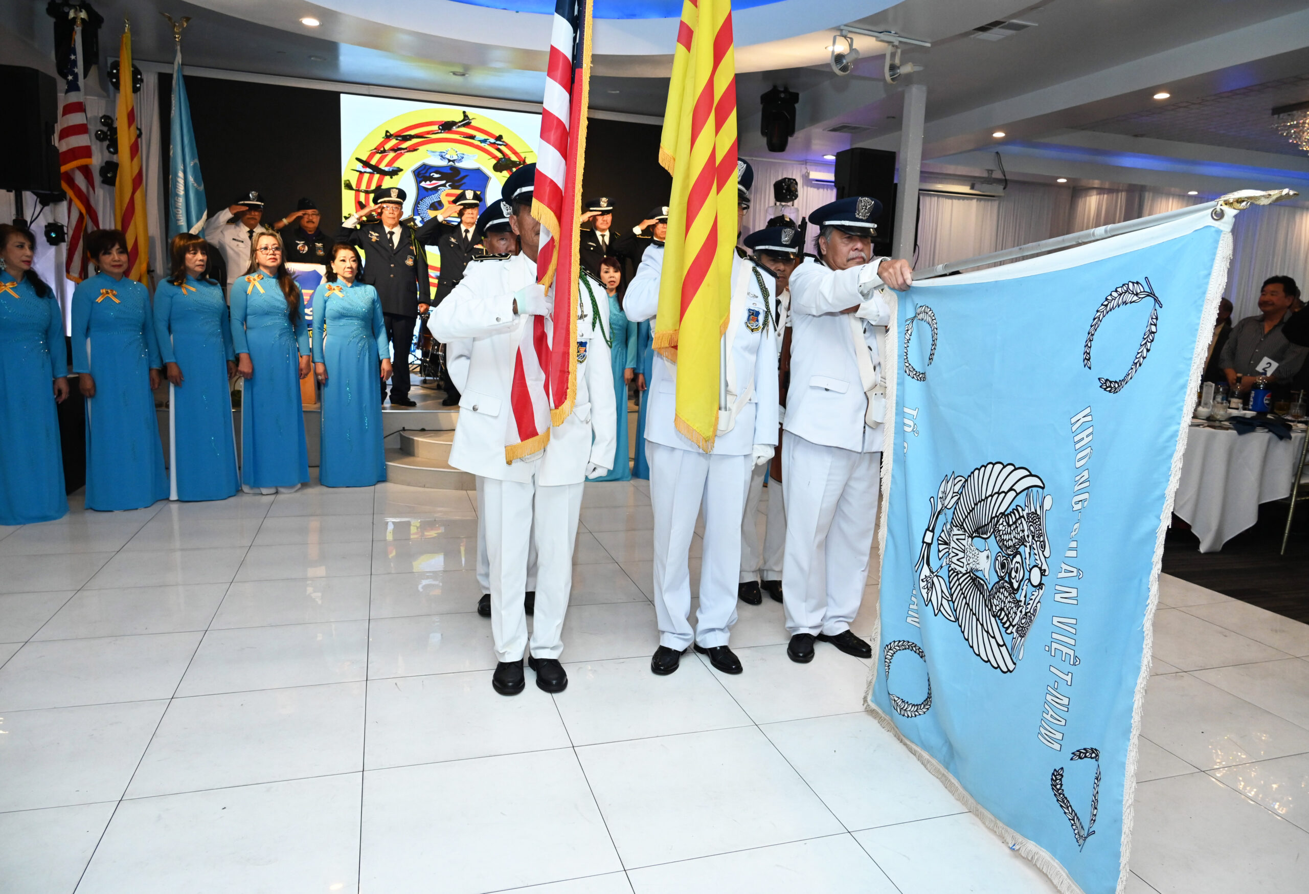 Nghi thức chào quốc quân kỳ trong lễ kỷ niệm 69 năm thành lập Không Quân VNCH. (Hình: Văn Lan/Người Việt)