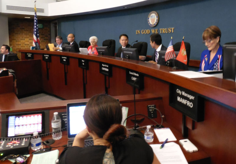 Bài báo nêu trên dựa theo bài báo của báo mạng Voice of OC, theo nội dung bản khiếu nại dài 14 trang của ông Kevin Baker, cựu cảnh sát trưởng, tố cáo một số dân cử trong thành phố có một số hành động mà ông gọi là “tham nhũng lan tràn thành phố, dân cử hành động giống như ‘băng đảng,’ tìm cách dùng cảnh sát để gây sức ép với doanh nghiệp địa phương và trừng phạt đối thủ chính trị.”