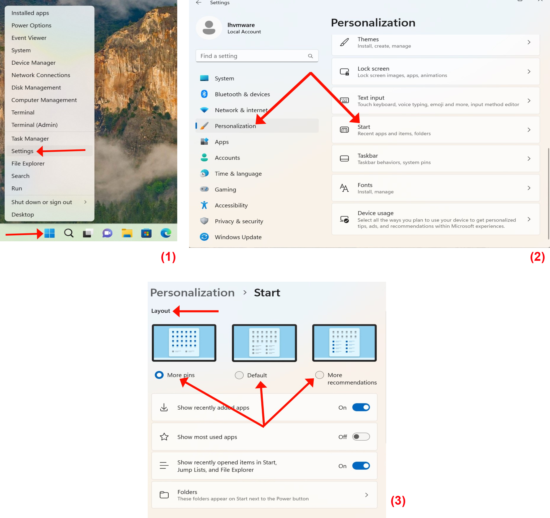 Trong phần Layout, bạn chọn bố cục theo một trong ba lựa chọn, bao gồm More pins: thêm hai hàng biểu tượng bổ sung trên mỗi trang và chỉ hiển thị một hàng cho các mục được đề nghị. Default: hiển thị ba hàng biểu tượng và ba hàng mục được đề nghị. More recommendations: chỉ hiển thị hai hàng ghim và lên tới bốn hàng đề nghị. (Hình 3)