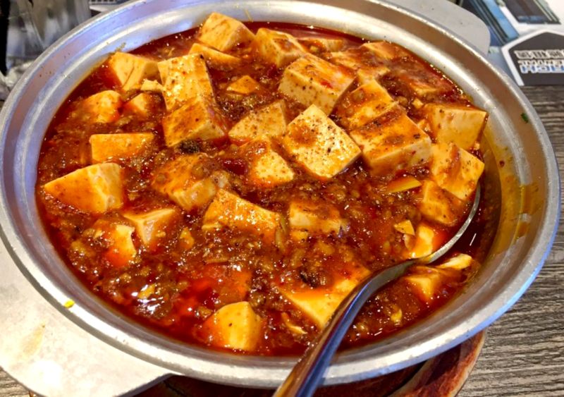 Nhấm nháp vài miếng trừu, húp chén súp cá thì nhân viên dọn món đậu hủ mapo ra, và đây là một đại diện cho ẩm thực Tứ Xuyên.