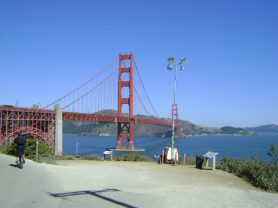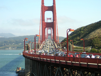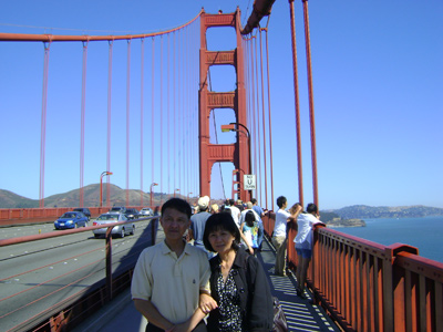 Sau khi dạo chơi ngắm cảnh chụp hình ở công viên bên đầu cầu phía Nam, chúng tôi quyết định lên xe để tiếp tục qua cầu. Ngồi xe chạy trên cầu mới thấy cây cầu to lớn hoàng tráng như thể nào? Hai trụ cầu khổng lồ sơn màu đỏ có nhiệm vụ đỡ nguyên cây cầu với vài trăm chiếc xe đang chạy trên đó. Mỗi chiều lưu thông có 3 làn xe và hai bên là lối đi dành cho người đi bộ được rào cản rất an toàn, xe bên ngoài không va chạm được và bộ hành cũng không rơi xuống biển. Người đi bộ trên cầu rất đông, họ không buôn gánh bán bưng hay làm đội quân “cửu vạn” (gánh mướn) như ở quê hương xa cách mà là toàn khách du lịch. Du khách đủ mọi quốc tịch xuôi ngược dập dìu, kêu réo nói cười rôm rả, đứng trên cầu hướng máy ảnh về thành phố San Francisco.