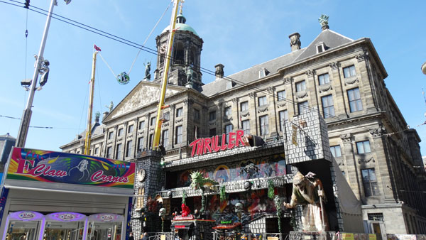 Quảng trường lát đá, không rộng lắm nhưng những kiến trúc xung quanh trông khá bề thế. Hôm chúng tôi tới Amsterdam, ở quảng trường có một hội chợ. Không khí vui chơi ở đây khá náo nhiệt, nhất là vào ban đêm.