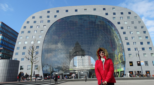 Xe ngừng tại một khu chợ mới xây của Rotterdam để chúng tôi vào xem và mua sắm tùy ý. Khu chợ này nằm cạnh một quảng trường lớn, nơi có nhà ga xe điện và thư viện của thành phố. Do trời hơi lạnh nên chúng tôi chụp vội vài tấm hình và nhanh chóng bước vào trong để xem khu chợ mới của Rotterdam.