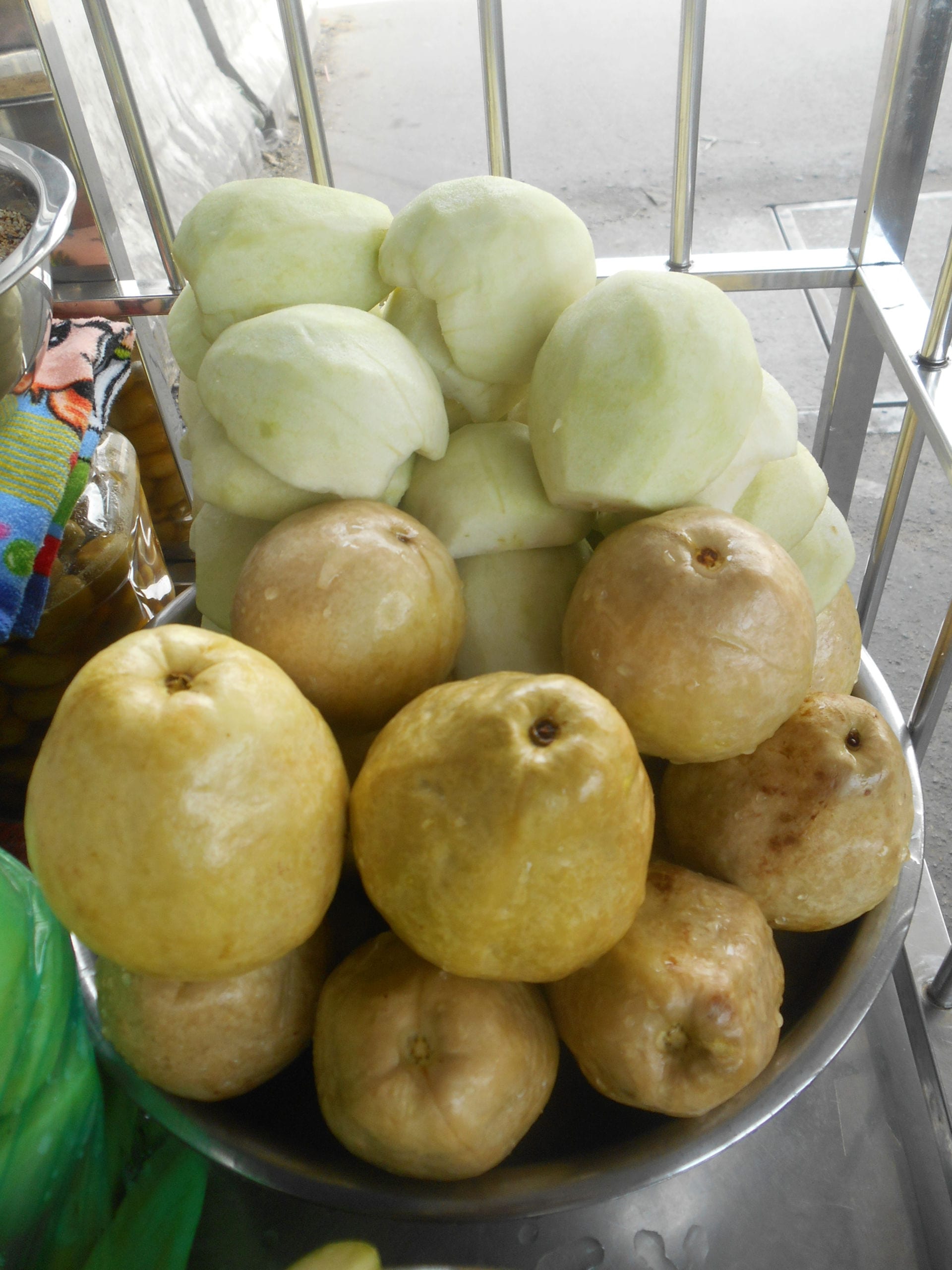 Xe bán trái cây xẻ của bà Nhi gồm các thứ trái cây như xoài, me, cóc… trong đó món ổi luộc được đông đảo khách chiếu cố, thưởng thức vì lạ miệng. Nhiều người “ghiền” ăn món ổi luộc bình dân này.