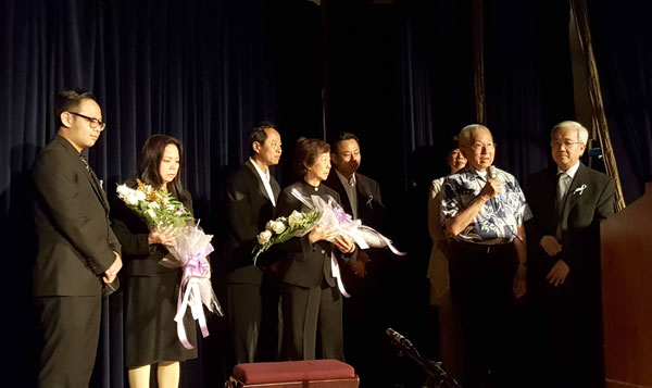 Gia đình cố nhạc sĩ Huỳnh Hữu Ðoan nhận hoa từ ban tổ chức. (Hình: Ðức Tuấn/Người Việt)