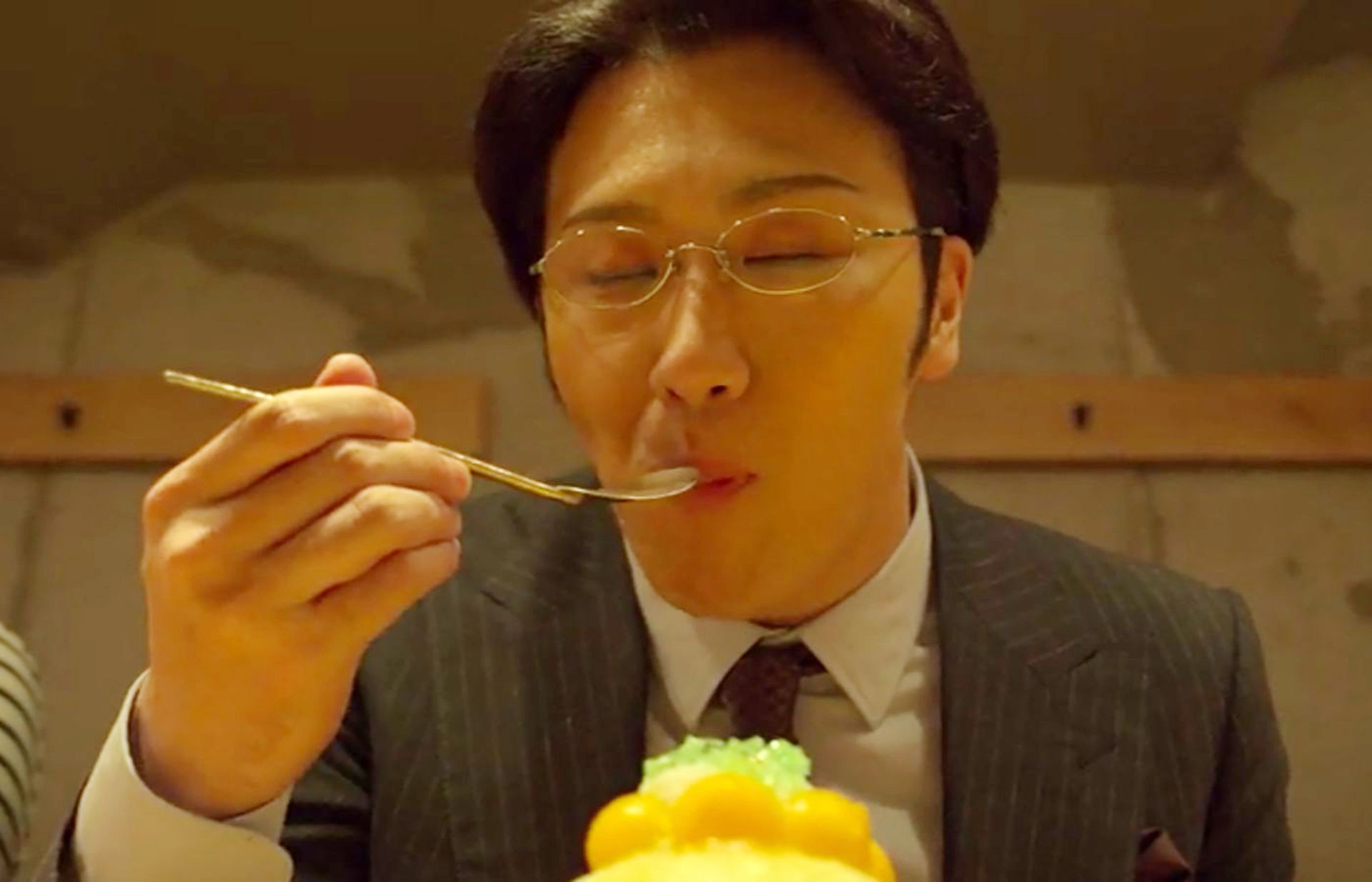 Nhân vật chính Ametani Kantarou thưởng thức một món ngọt trong phim “Kantaro: The Sweet Tooth Salaryman.” (Hình: warosu.org)