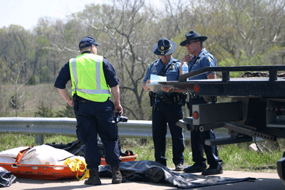 KANSAS CITY, Missouri (AP) –Một thiếu niên 17 tuổi với bằng lái giới hạn là người lái chiếc xe chở khách bị rớt xuống gầm cầu ở gần Kansas City sáng hôm Chủ Nhật, làm chết 5 người cùng trong gia đình của cậu từ Minnesota. Giới chức thẩm quyền chuyển các xác chết trong tai nạn xe rớt xuống gầm cầu, từ khe nước lên mặt đường xa lộ, gần Kansas City. (Hình: AP/Jeanny Sharp)