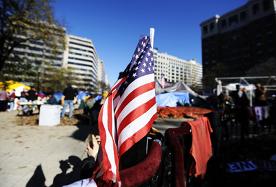 Một lá cờ Mỹ tại chỗ cắm trại của nhóm Chiếm Ðóng DC. Cảnh sát vừa truy tố bốn người tội không cẩn thận khi nổi lửa đốt cờ ở Charlotte. (Hình: Jewel Samad/AFP/Getty Images)