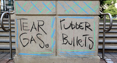 Giới chức thành phố cho hay có ba cảnh sát viên và một số người biểu tình bị thương trong các cuộc đụng độ. Tòa Thị Chánh bị mấy chục người dùng xà beng nạy cửa xông vào, lấy một lá cờ Mỹ rồi đốt ở ngay bực thềm nơi này. Họ cũng đập phá đồ đạc bên trong, kể cả một mô hình của Tòa Thị Chánh mà Thị Trưởng Jean Quan cho hay đã trưng bày từ khoảng 100 năm nay. Phấn viết chữ “hơi cay” và “đạn cao su” trên lối vào khu văn phòng Frank Ogawa Plaza ở Oakland hôm Thứ Hai. (Hình: AP Photo/Ben Margot)