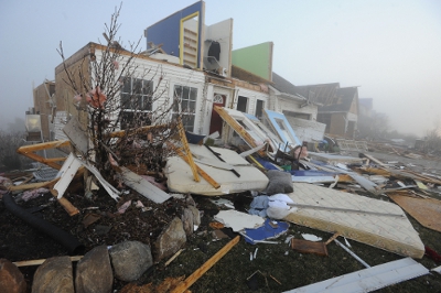 Một trong hơn 100 căn nhà hư hại ở Dexter, Michigan, sau khi bão lốc đi qua vào tối Thứ Năm, 15 Tháng Ba, 2012. Sở Khí Tượng Quốc Gia cho biết gió mạnh đến 135 dặm/giờ. (Hình: AP/Detroit News, Daniel Mears)
