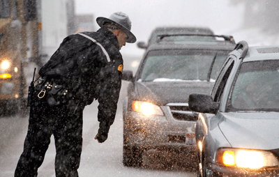SEATTLE (AP) – Các trường học phải lo đóng cửa trước, các toán nhân viên bảo trì đường sá lo đổ muối xuống đường và hơn hai chục chuyến bay đến các thành phố ở vùng Tây Bắc Mỹ bị hủy khi khu vực này chuẩn bị cho trận bão lớn kéo đến hôm Thứ Tư. Cảnh sát tiểu bang Washington kiểm tra xe trên Xa Lộ 90 trong lúc tuyết rơi. (Hình: AP Photo/Elaine Thompson)