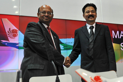 Ông Rusdi Kirana (phải), sáng lập viên kiêm giám đốc Lion Air, bắt tay ông Dinesh Keskar, phó chủ tịch công ty Boeing phụ trách thương mại khu vực Ấn Ðộ và Châu Á Thái Bình Dương, sau khi ký xong giao kèo mua máy bay trị giá $22.4 tỉ. (Hình: Roslan Rahman/AFP/Getty Images)