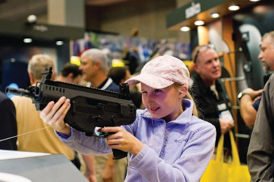 ST. LOUIS, Missouri (Getty Images) – Bé gái Bailey Chappuis, 12 tuổi, cầm thử cây súng Beretta ARX 160 hôm Thứ Sáu tại đại hội thường niên và hội chợ của hiệp hội người dùng súng NRA, ở St. Louis, Missouri.