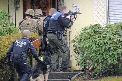 Người này đã lẩn trốn và cảnh sát vẫn đang truy lùng. Trong hình nhỏ, cảnh sát đột nhập căn nhà nơi nghi can được cho là đang ở trong đó, nhưng căn nhà trống và không có ai trong đó.