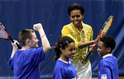 WASHINGTON D.C. – Ðệ Nhất Phu Nhân Hoa Kỳ Michelle Obama cùng phu nhân thủ tướng Anh Quốc, Samantha Cameron (không có trong hình), cùng những học sinh được chọn tranh tài “mini-Olympics” để chào đón Thế Vận Hội mùa Hè tại Luân Ðôn đang cùng nhau thực hiện chương trình cổ động của bà Obama – “Let’s Move!”