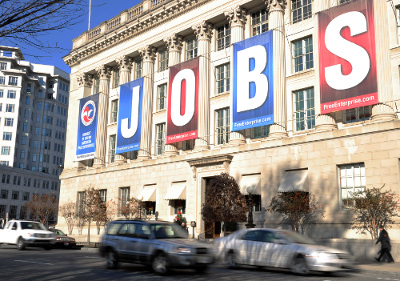 Biểu ngữ tuyển người treo trước trụ sở Phòng Thương Mại Washington D.C. (Hình: Karen Bleier/AFP/Getty Images)